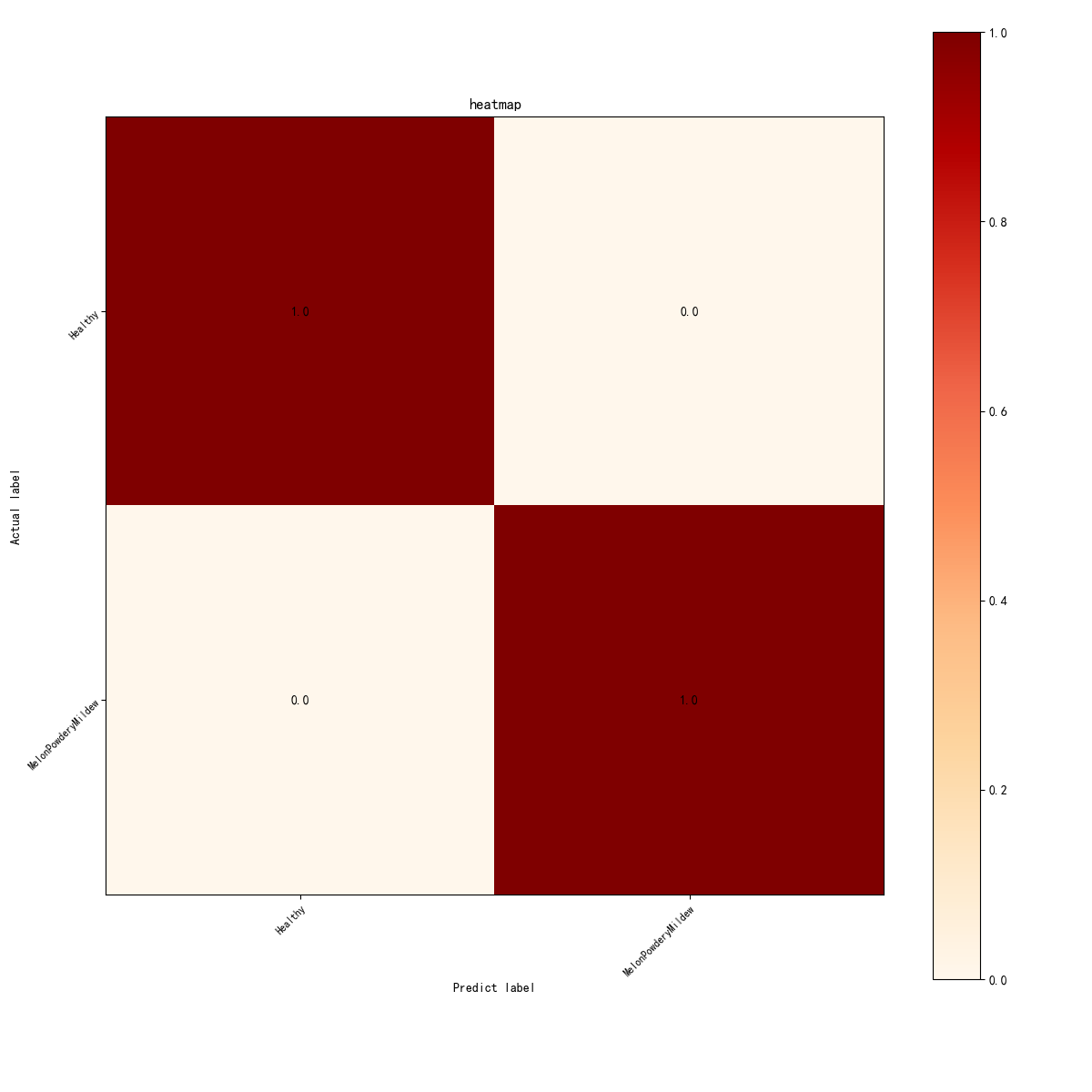 从混淆矩阵热力图可以看出,模型在健康叶片和白粉病叶片两类上均实现了100%的正确分类,对角线区域颜色最深且数值为1.0,非对角线为0.0,说明MobileNetV3模型无误判与漏判,分类性能极佳、识别准确率达到完美水平。