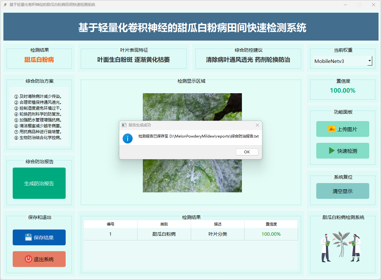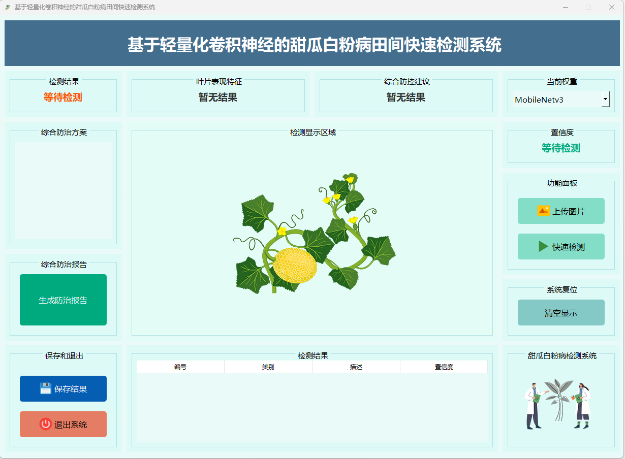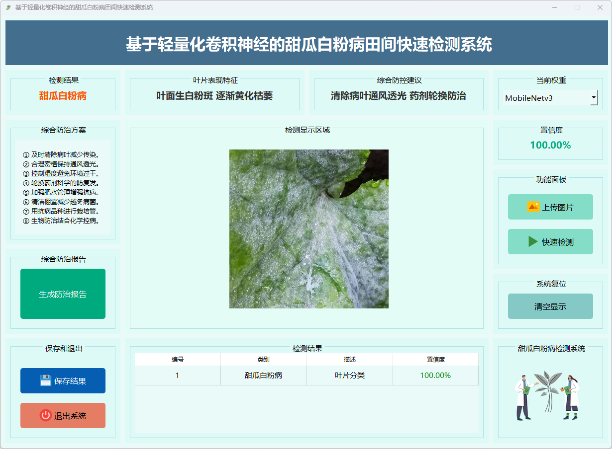 本系统基于轻量化卷积神经网络 MobileNetV3 模型,实现甜瓜白粉病的田间快速检测,集成图像预处理、特征提取、分类推理与结果可视化,为甜瓜白粉病的智能识别与病害防控提供技术支持