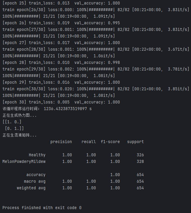训练结果显示,模型在30个训练周期后已稳定收敛,训练损失降至极低水平,验证准确率达到100%,说明MobileNetV3模型在甜瓜叶片分类任务上具有优异的学习能力和极强的识别精度。