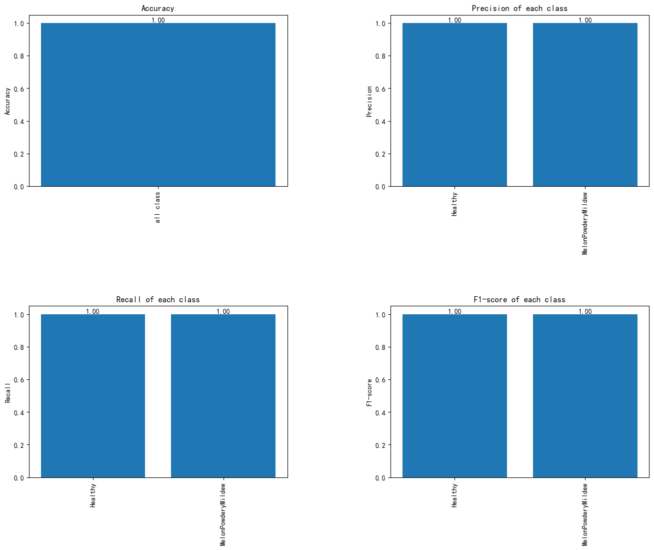 从模型评估指标图可以看出,MobileNetV3在甜瓜叶片分类任务中表现极为出色,整体准确率、精确率、召回率及F1值均达到1.00,说明模型在区分健康叶片与白粉病叶片时实现了完全正确的识别,没有出现误判或漏判,体现出极高的稳定性与泛化能力,分类性能达到最佳水平。