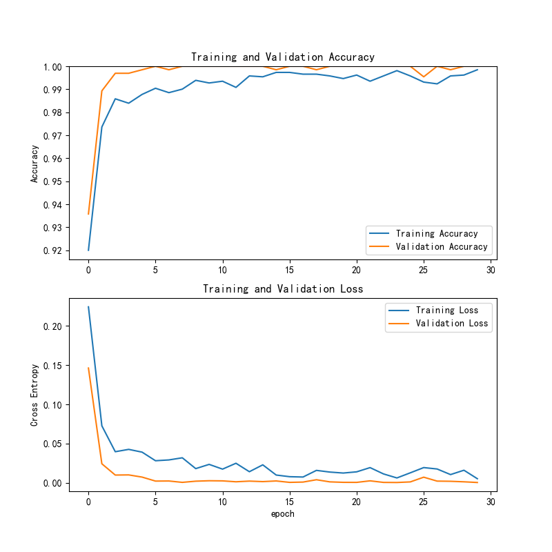 训练轮次30轮,耗时约20.6分钟,训练损失从 0.224(epoch 1)降至 0.005(epoch 30),验证准确率从 0.936(epoch 1)提升至 1.000(epoch 30)。