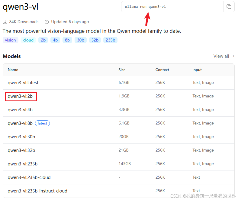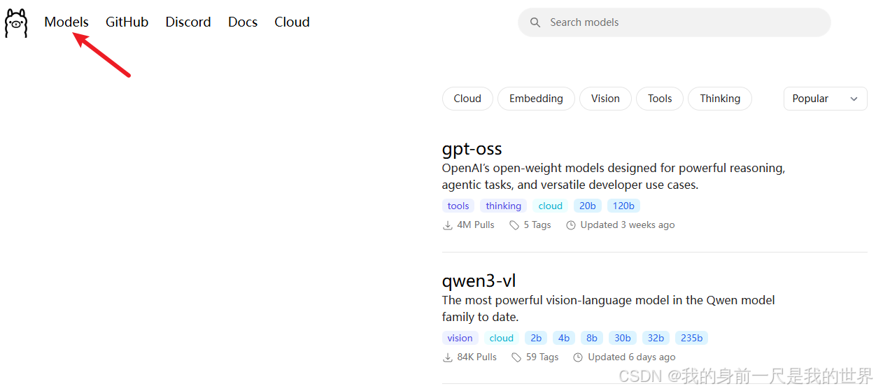 第三步:Ollama只是一个平台,还没有下载我们想要的LLM,我们可以去官网选择合适的LLM。因为我们的重点是学习LangChain,所以推荐大家下载轻量级的LLM即可。