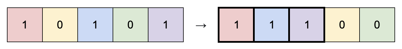 - 对每一行按照从大到小进行降序排序,目的是让较高的列尽可能靠左,从而最大化全 1 子矩阵的面积。,如下: