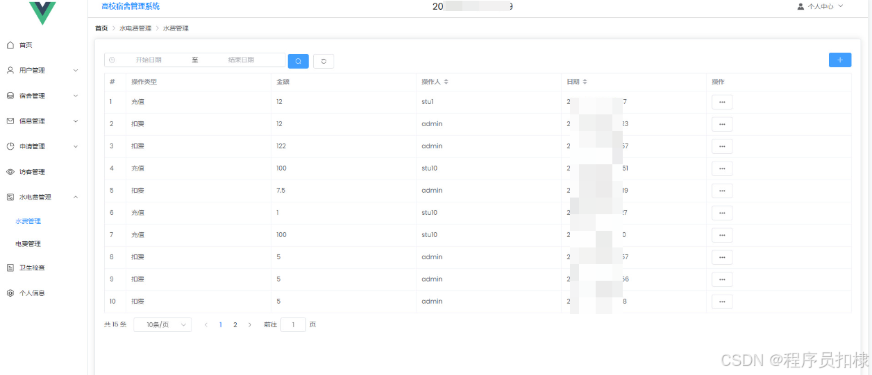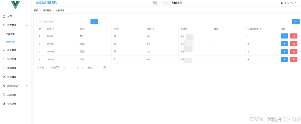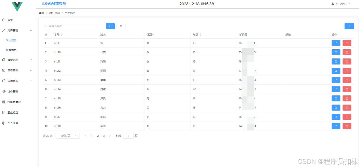 系统管理员:登录、学生管理、宿管管理、楼宇信息、房间信息、公告信息、报修信息、调宿申请、访客管理、水电费管理、卫生检查、个人信息。