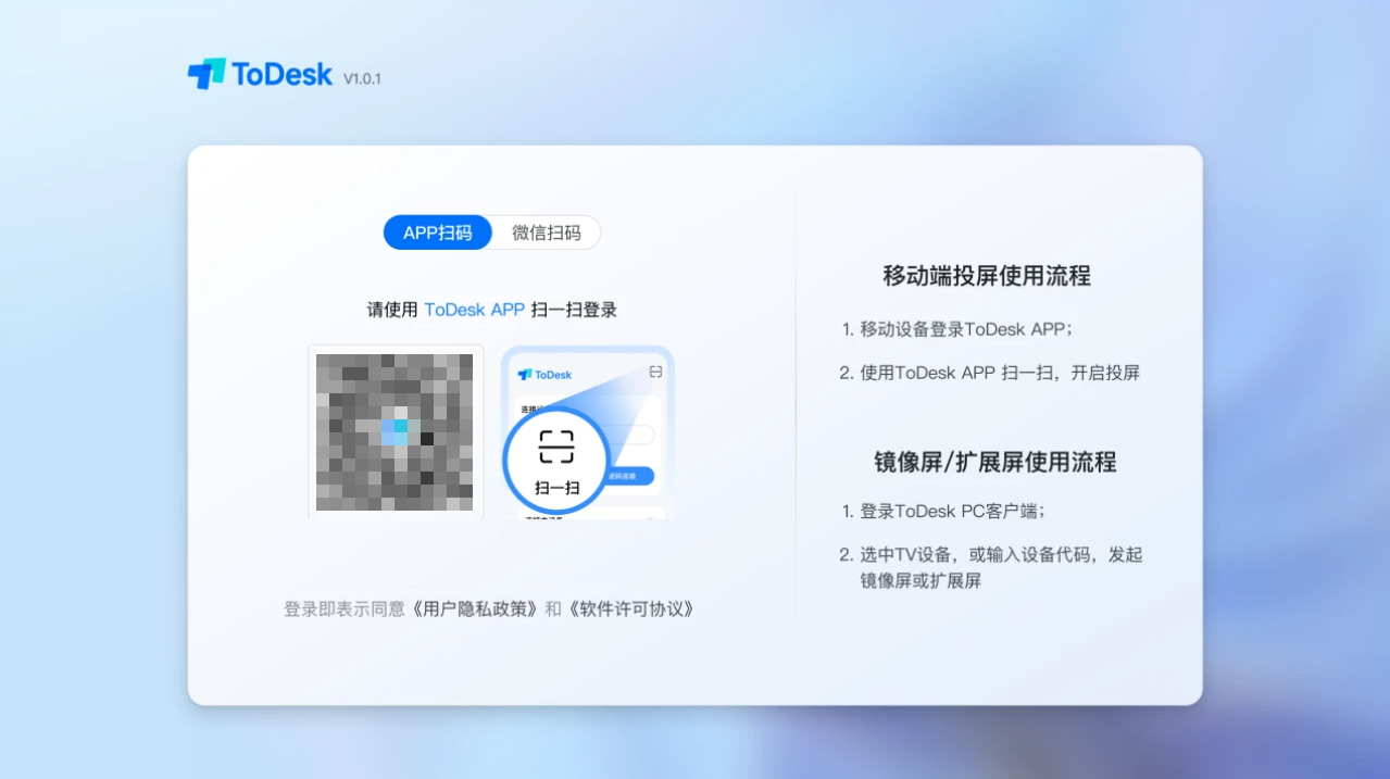 首先,在TV端,找到ToDesk APP;打开后,可以看到界面中显示有APP扫码登录或微信扫码登录两种方式,酌情任选即可。