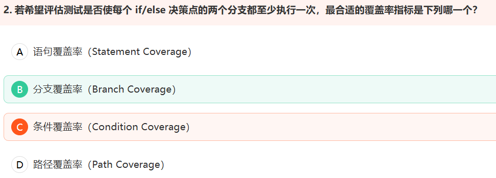 题目要求评估测试是否覆盖了每个 if/else 决策点的两个分支(即真分支和假分支)。分支覆盖率(Branch Coverage)专门测量每个控制结构(如 if 语句)的真假分支是否都被执行,因此是最合适的指标。其他选项中:语句覆盖率(A)只关注语句执行,不保证分支覆盖;条件覆盖率(C)关注布尔子条件的取值,而不是整个分支;路径覆盖率(D)要求覆盖所有路径组合,更全面但不直接针对每个决策点的分支覆盖。