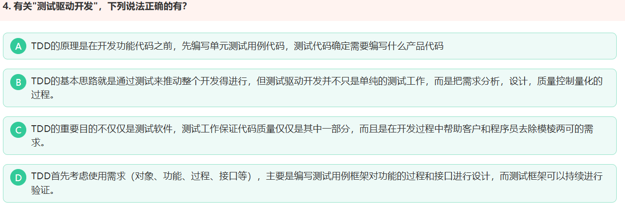 B选项正确:TDD不仅仅是测试工作,而是一个完整的开发方法论。它将需求分析、设计和质量控制有机地结合在一起,形成了一个可量化的过程。通过测试来推动开发,使整个开发过程更加规范和可控。