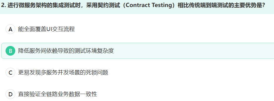 契约测试的主要优势是降低服务间依赖导致的测试环境复杂度,因为它通过模拟服务接口依赖,允许独立测试每个服务,而无需部署整个系统。