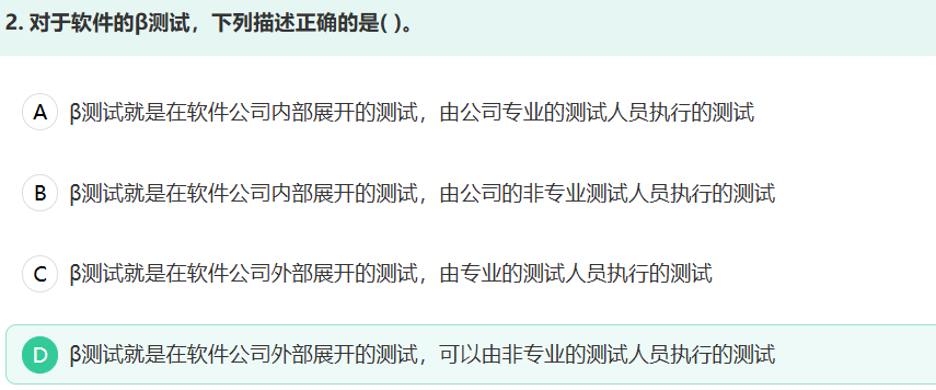 - 系统测试:由开发团队执行,验证系统整体功能,与 Beta 测试无关。