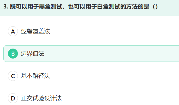 | 边界值法 | 黑盒测试和白盒测试 | 正确答案,关注输入域的边界情况 |