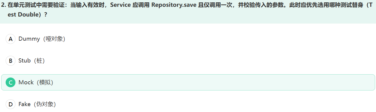 | D. Fake(伪对象) | 具有真实逻辑的简化实现,内部可能用内存数据或简化算法模拟真实依赖,但不用于生产环境。 | “模拟厨房”:用玩具食材和简化步骤做出“看起来像真的”的菜(有真实逻辑,但不是实际厨房的复杂流程)。 | 1. 有真实逻辑,可独立运行(如用内存数据库替代真实数据库);2. 比Stub功能强,但比真实依赖简单。 | 测试数据持久层时,用Fake内存数据库替代真实MySQL,支持增删查改(逻辑真实),但数据仅存于内存。 |