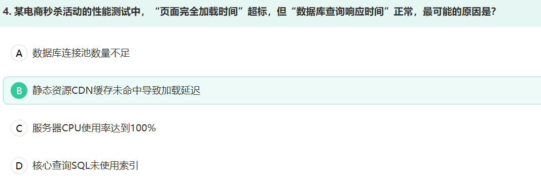 在性能测试中,“页面完全加载时间”超标但“数据库查询响应时间”正常,表明数据库层性能无问题。页面完全加载时间包括静态资源(如CSS、JavaScript、图片等)加载、服务器处理和数据库查询。数据库查询响应时间正常排除了数据库相关因素(如选项A、D可能导致数据库延迟),服务器CPU使用率100%(选项C)可能影响整体性能,但数据库响应正常说明数据库服务器正常。选项B(静态资源CDN缓存未命中导致加载延迟)直接影响页面资源加载,与数据库无关,因此是最可能的原因。