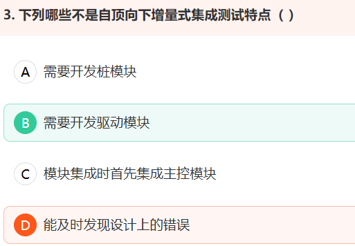 - B. 需要开发驱动模块:驱动模块是自底向上测试的特征,用于调用底层模块。自顶向下方法无需驱动模块,因其从主控模块开始测试,直接控制流程。