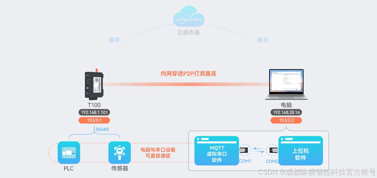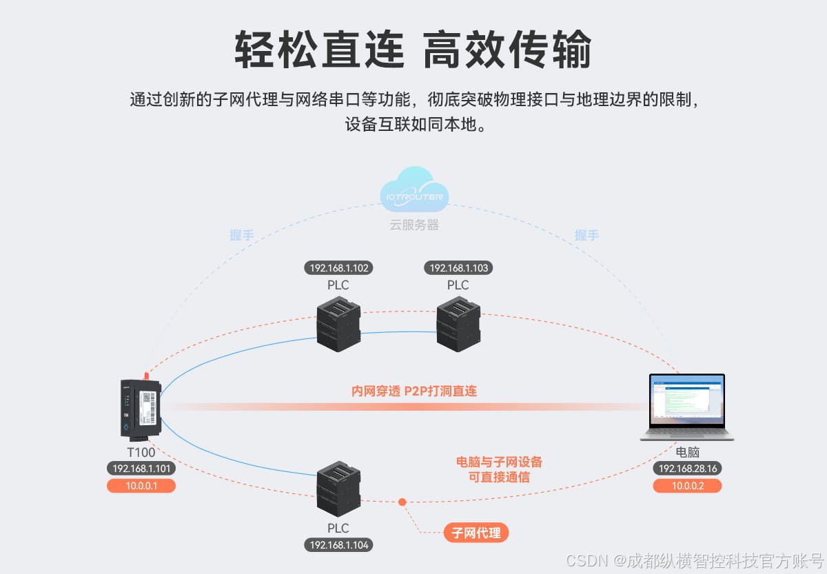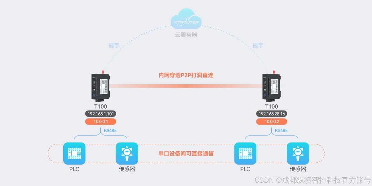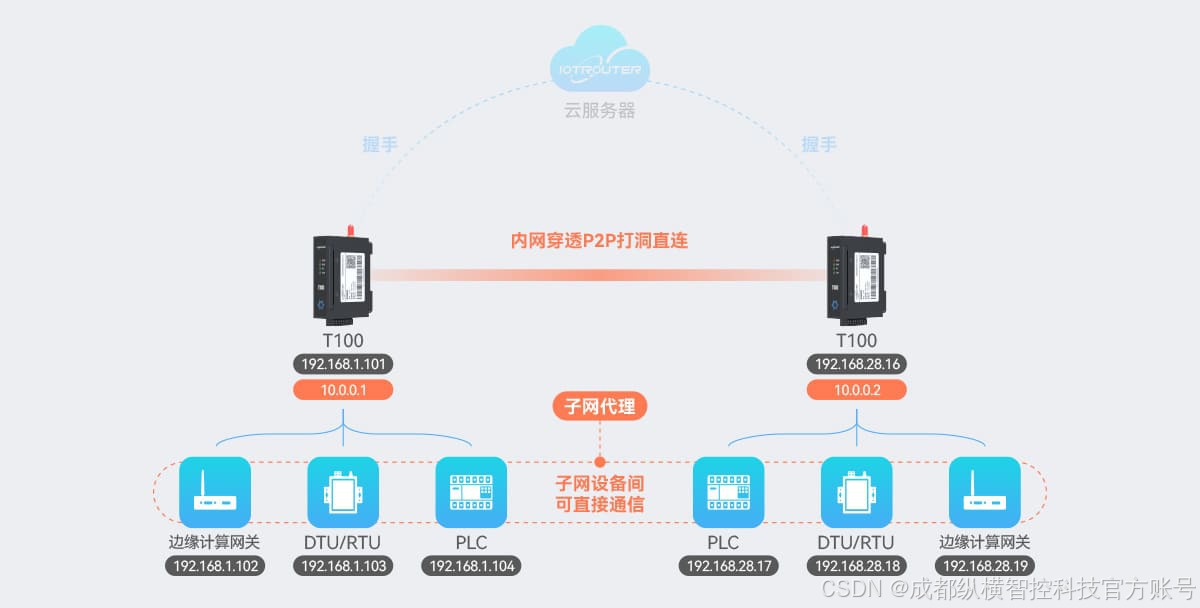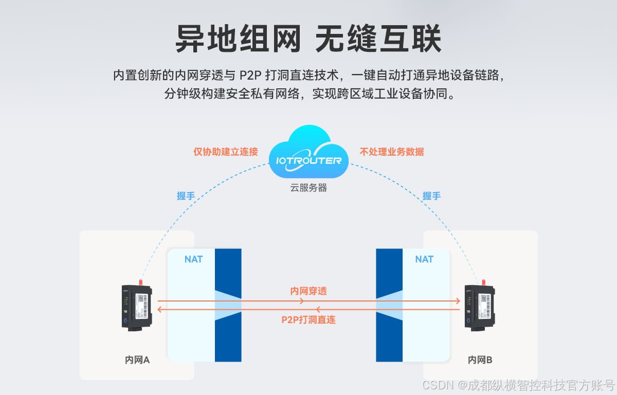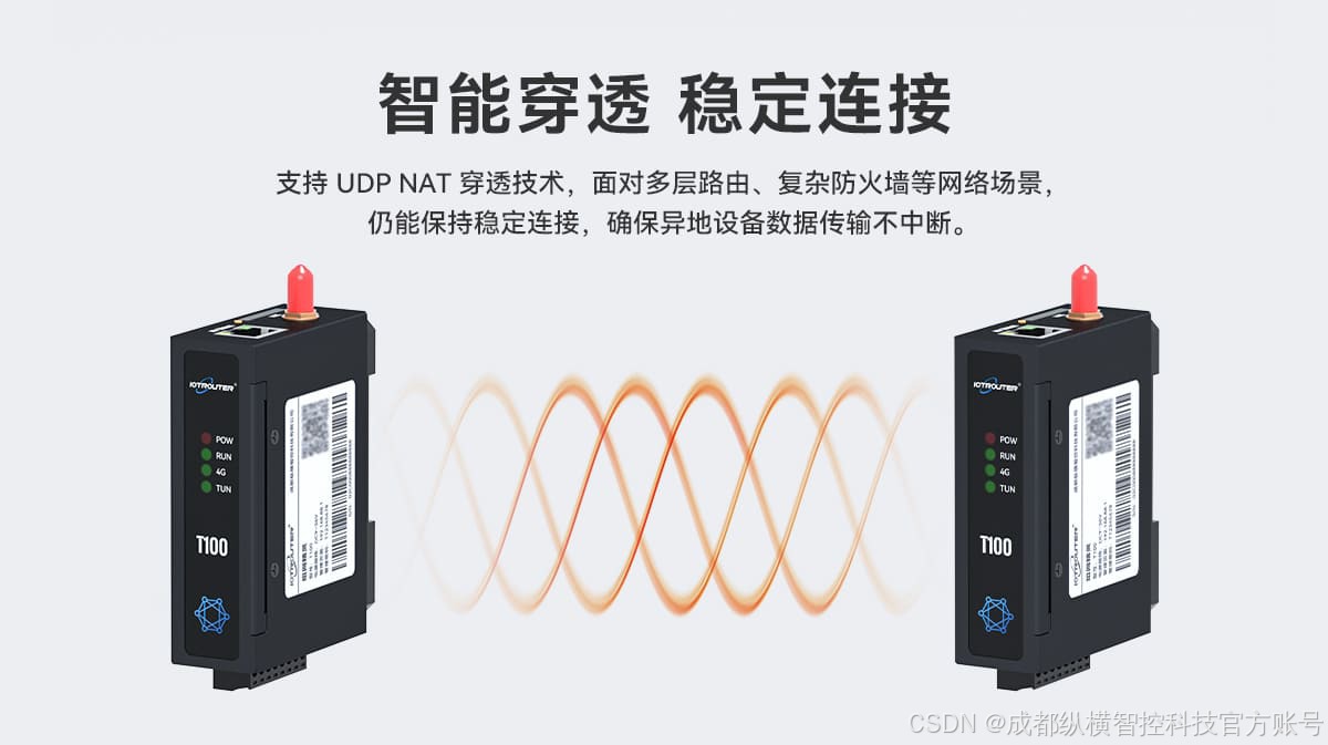 在这种背景下,纵横智控推出的 组网精灵 T100,并不是在堆参数,而是在回应一个普遍的行业需求——让复杂网络变得简单可控。它不依赖公网IP,也不需要专门的VPN配置,而是通过内置的 P2P 打洞与 UDP NAT 穿透技术,让设备在多层路由、复杂防火墙下依然能直接通信。