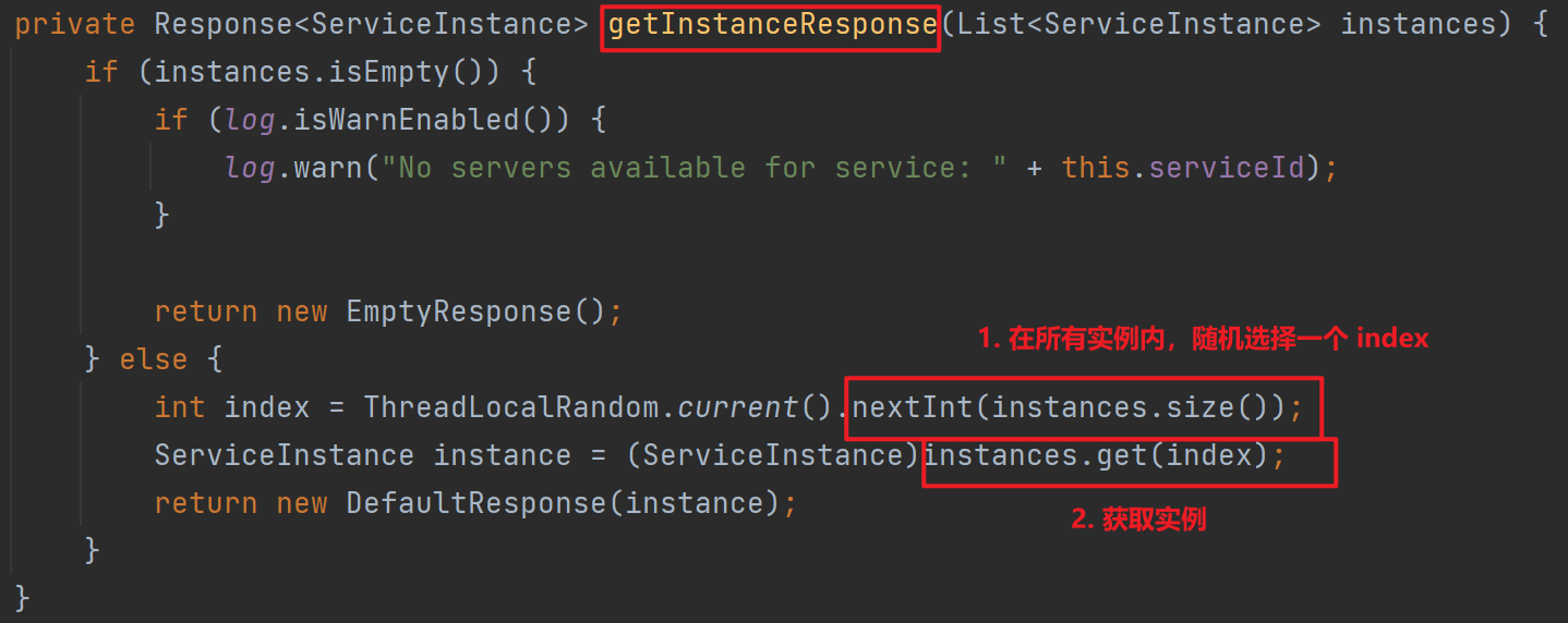 public class CustomLoadBalancerConfiguration {@BeanReactorLoadBalancer<ServiceInstance> randomLoadBalancer(Environment environment,LoadBalancerClientFactory loadBalancerClientFactory) {String name = environment.getProperty(LoadBalancerClientFactory.PROPERTY_NAME);return new RandomLoadBalancer(loadBalancerClientFactory.getLazyProvider(name, ServiceInstanceListSupplier.class),name);}