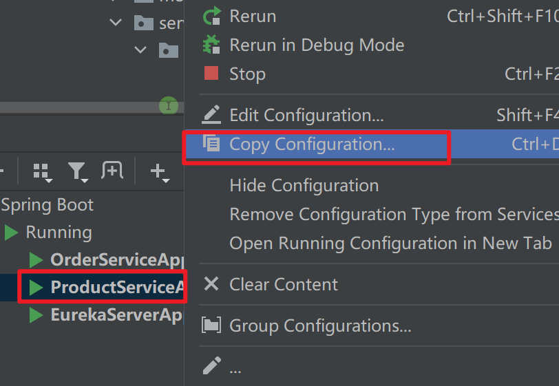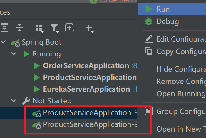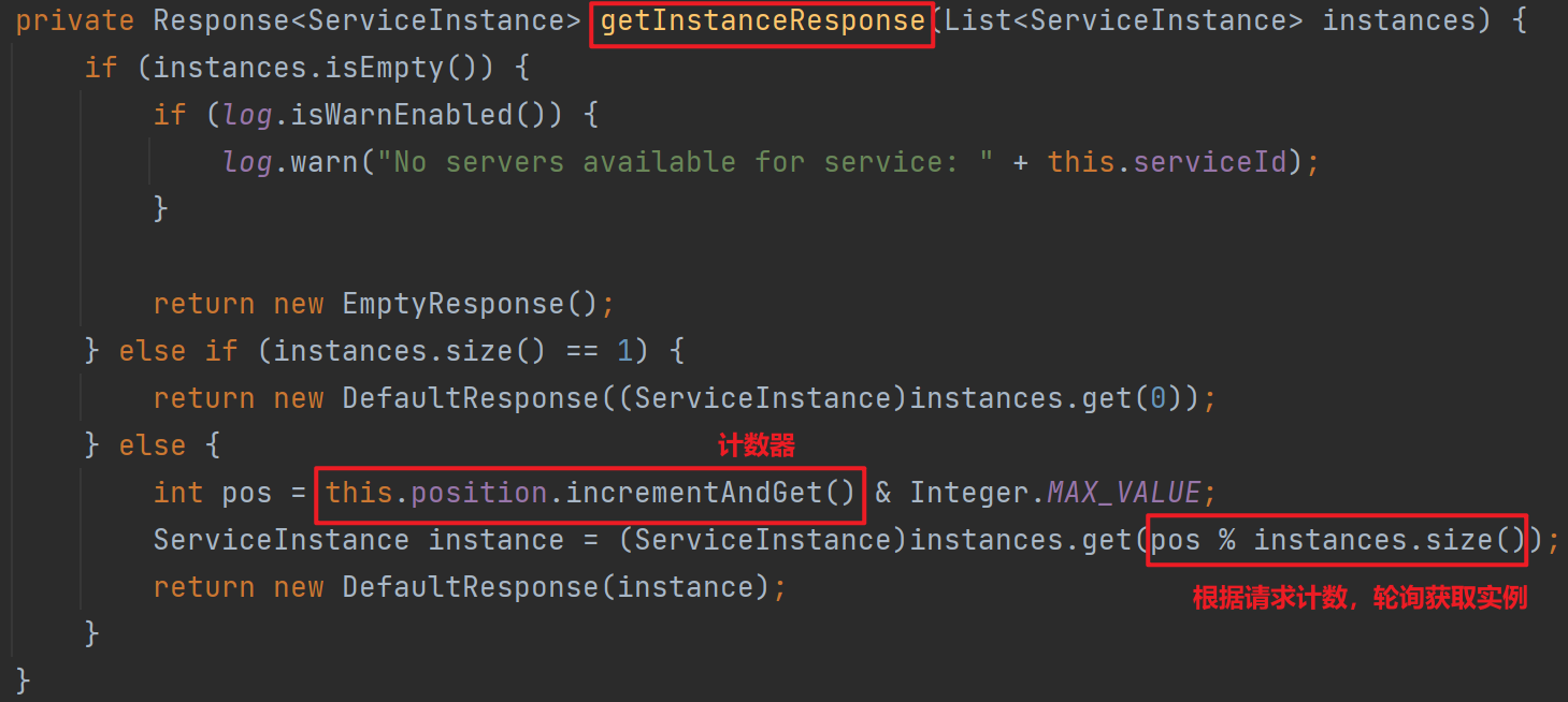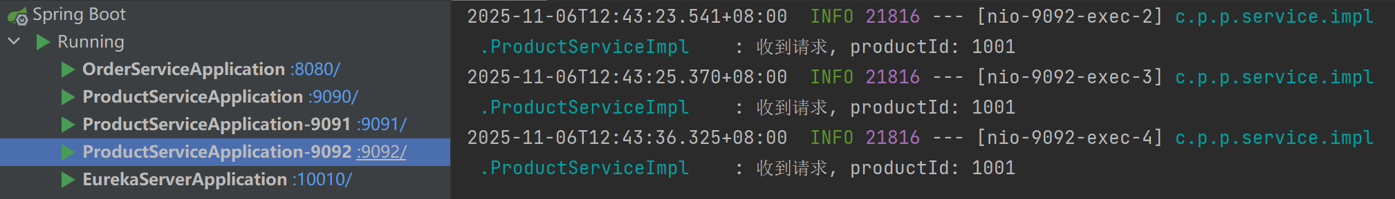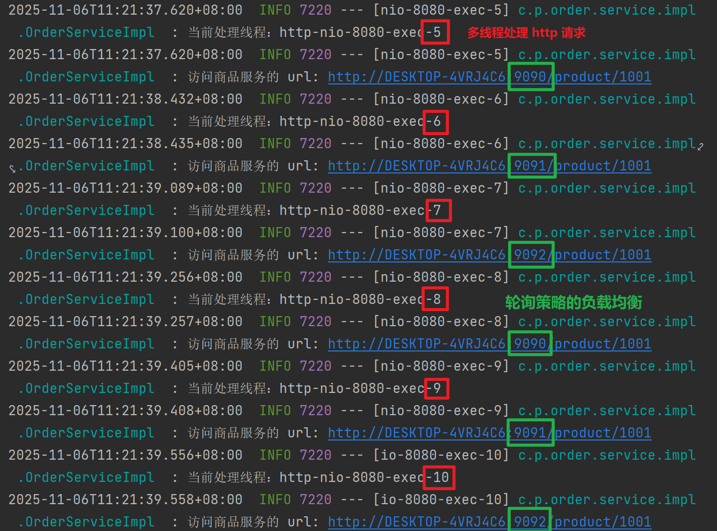 // 原子计数器,保证线程安全private AtomicInteger count = new AtomicInteger(0);private List<ServiceInstance> instances;private int size;@PostConstructpublic void init() {//从Eureka中获取服务列表,指定要查询的服务名// 在应用启动、类加载时,初始化服务列表,避免在请求时再次获取导致每次拿到的服务列表顺序不同instances = discoveryClient.getInstances("product-service");size = instances.size();}@Overridepublic OrderInfo getOrder(String orderId) {// 打印当前线程名称log.info("当前处理线程:{}", Thread.currentThread().getName());OrderInfo orderInfo = orderMapper.selectOrderById(orderId);// 多个商品服务,请求计数器 % size 获得当前请求的服务实例在列表中的 index,实现轮询策略的负载均衡String uri = instances.get(count.getAndIncrement() % size).getUri().toString();// 构造访问商品服务的 urlString url = uri+"/product/"+orderInfo.getProductId();log.info("访问商品服务的 url: " + url);// 使用 restTemplate 访问商品服务ProductInfo productInfo = restTemplate.getForObject(url, ProductInfo.class);// 把商品详情设置到 orderInfo 中orderInfo.setProductInfo(productInfo);return orderInfo;}