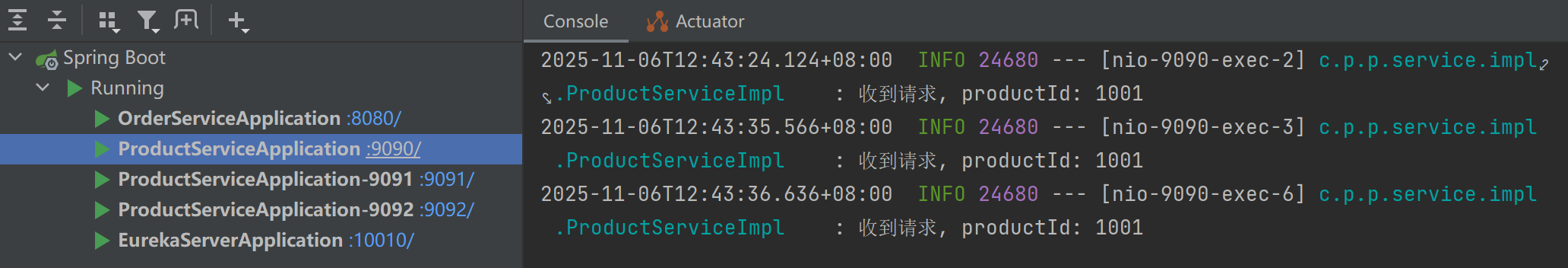 3、启动 注册中心、订单服务、多个商品服务实例,测试:实现了负载均衡,每个实例收到的请求差不错。