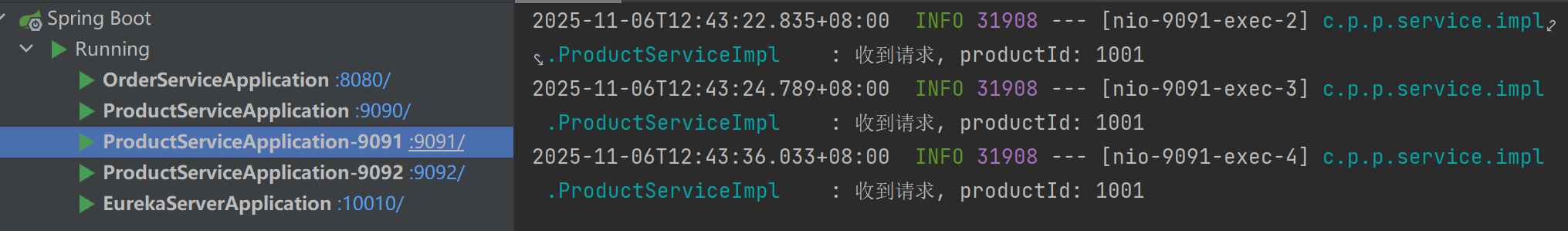 重新启动 order-service,测试:每个实例收到的请求数量是随机的。