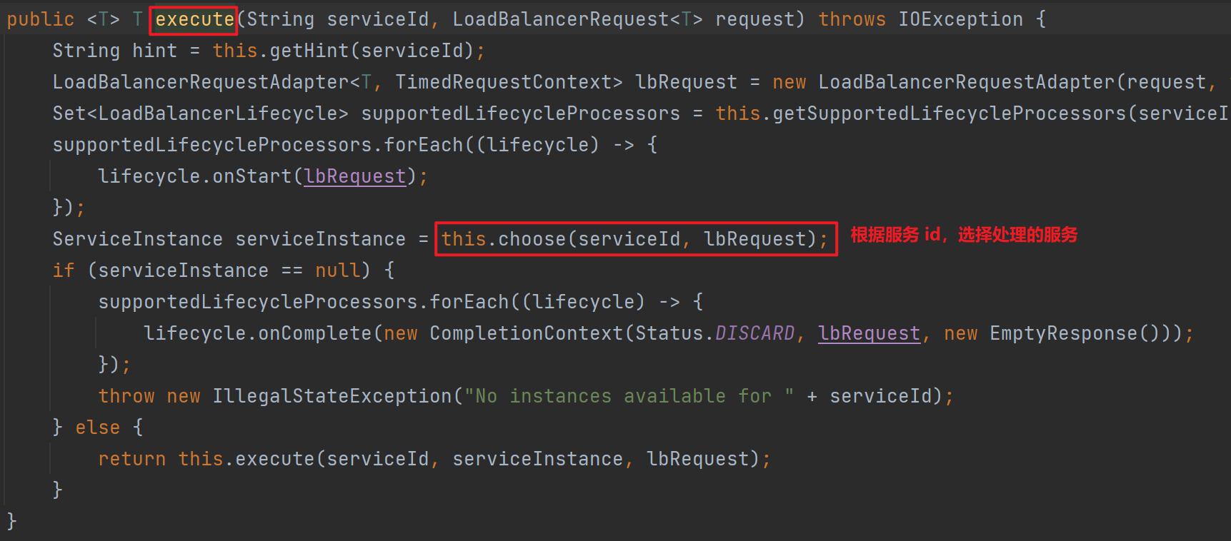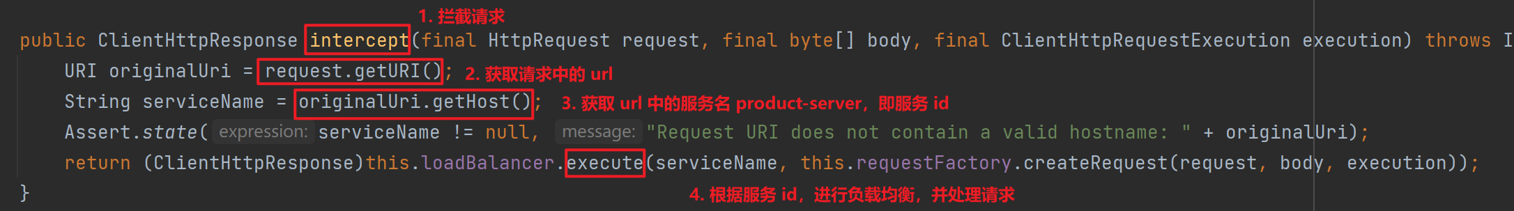 LoadBalancerInterceptor 类会对 RestTemplate 远程调用的请求进行拦截: