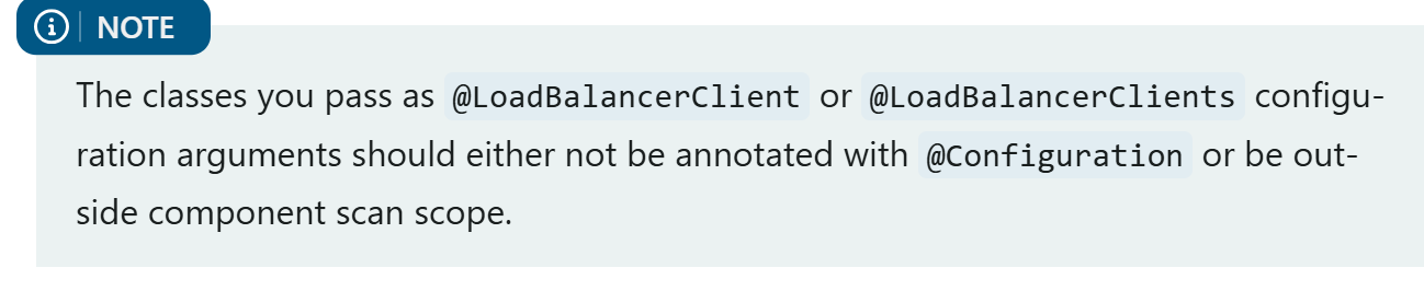 注意:使用 @LoadBalancerClient 或者 @LoadBalancerClients 给指定服务配置自定义负载均衡类,要么自定义类不加 @Configuration 注解,要么在 Spring 扫描之外(目的:期望实现对局部服务生效,而不是全局服务,不按提示做就会产生冲突)。