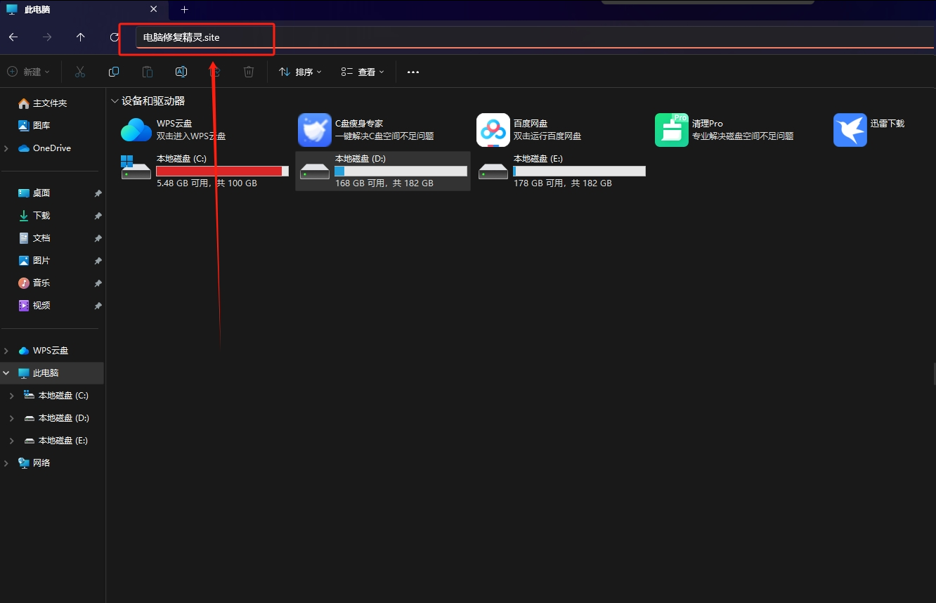 首先打开电脑,进入【此电脑】以后在顶部文件路径栏目输入:电脑修复精灵.site(鼠标移到右侧的箭头点击)或者直接点击回车键(Enter)打开检查工具。