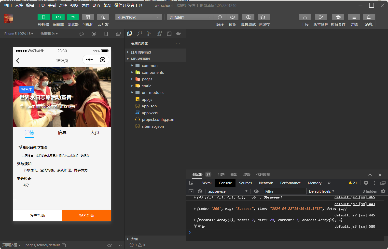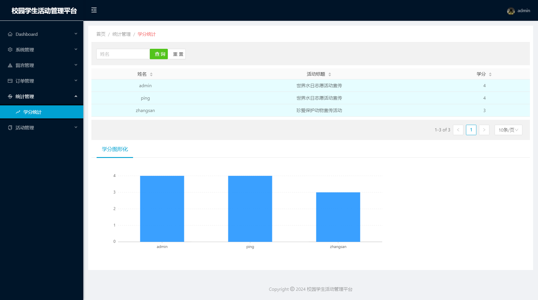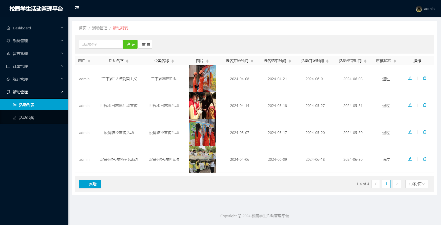登录、注册、首页、推荐活动、轮播图、活动详情、搜索活动、报名活动、发布活动,个人资料、修改密码、参与活动、学分统计、退出账号等等
