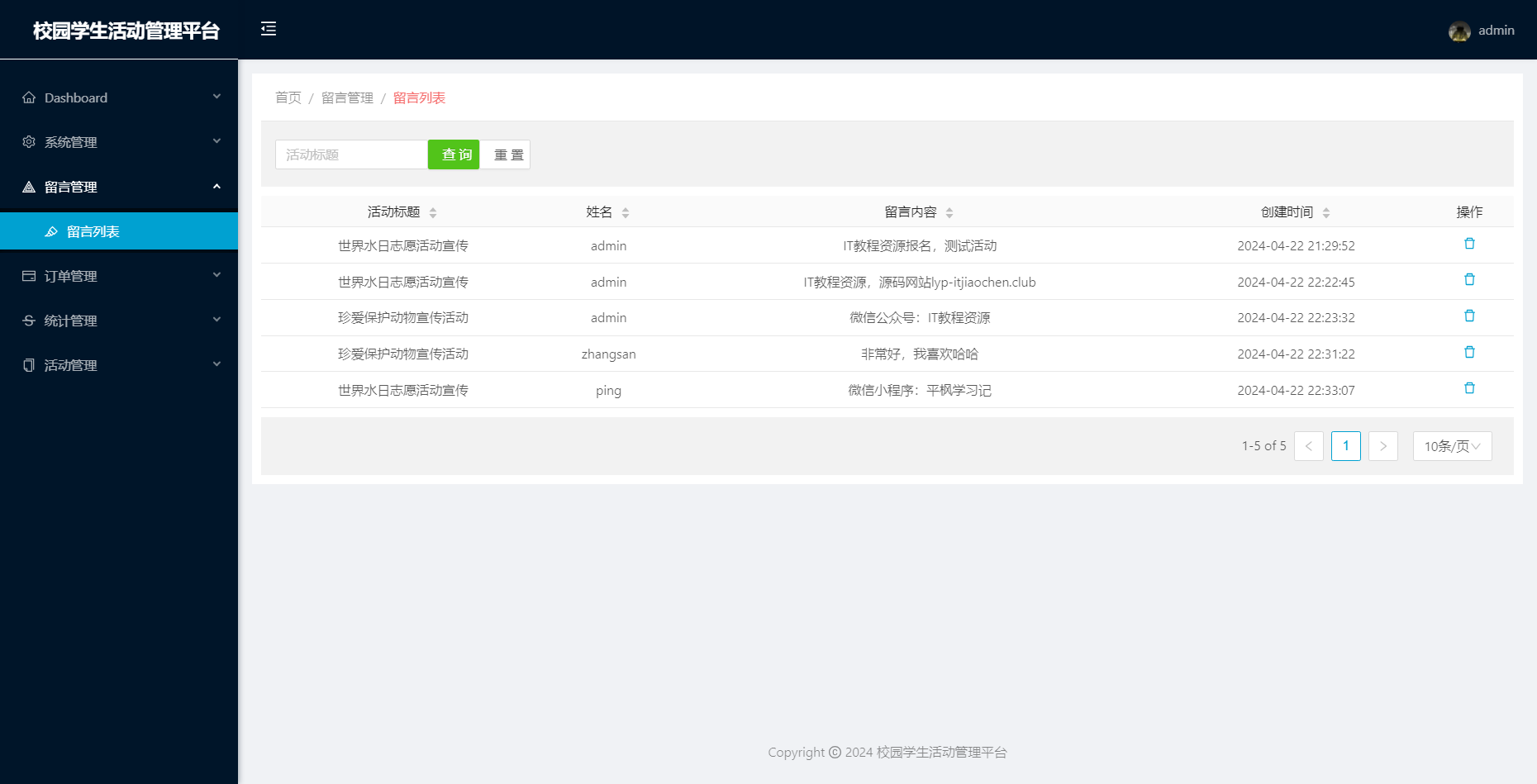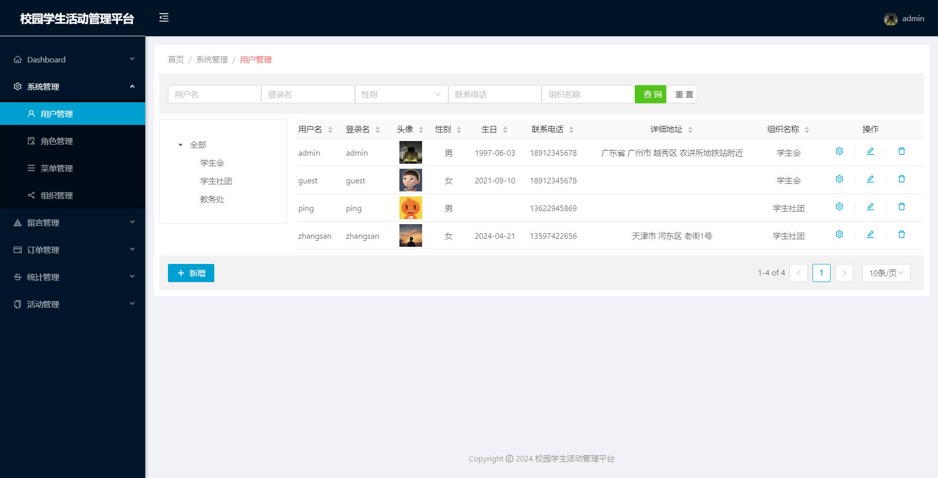 登录、修改密码、退出登录、首页、系统管理(用户管理、角色管理、菜单管理、组织管理)、留言管理、订单管理、统计管理、活动管理
