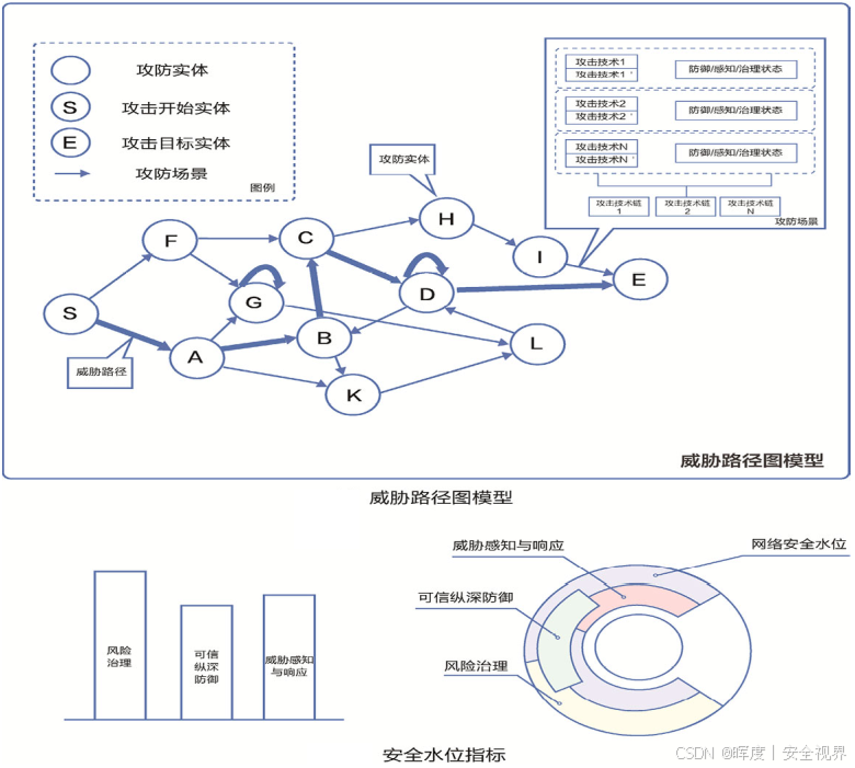 安全水位评估框架:该框架旨在系统化评估企业应对网络攻击的能力。分成三个部分:安全水位定义、威胁路径图模型、安全水位指标。这些部分共同构成一个完整的评估体系,帮助企业量化安全防护水平并持续改进。下面详细展开每个部分,并通过图表和生动描述增强理解。