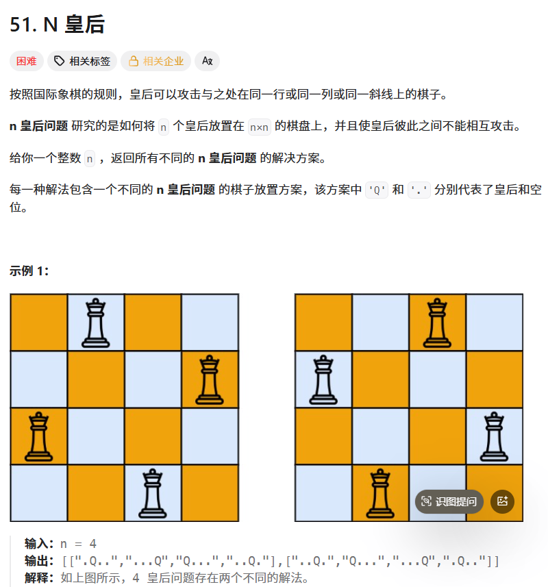class Solution {boolean[] checkCol, checkDg1, checkDg2;List<List<String>> ret;char[][] path;int m;public List<List<String>> solveNQueens(int n) {m = n;checkCol = new boolean[n];checkDg1 = new boolean[n * 2];checkDg2 = new boolean[n * 2];ret = new ArrayList<>();path = new char[n][n];for (int i = 0; i < n; i++) {Arrays.fill(path[i], '.');}dfs(0);return ret;}private void dfs(int row) {// 递归终止条件:如果已经处理完所有行,将当前解添加到结果列表中if (row == m) {List<String> tmp = new ArrayList<>();// 将当前路径中的棋盘状态转换为为字符串列表for (int i = 0; i < m; i++) {tmp.add(new String(path[i]));}ret.add(new ArrayList<>(tmp));}// 遍历当前行的所有列for (int col = 0; col < m; col++) {// 两个对角线是否有皇后if (!checkCol[col] && !checkDg1[row - col + m] && !checkDg2[row + col]) {// 放置皇后path[row][col] = 'Q';// 标记该列和对角线已被占用checkCol[col] = checkDg1[row - col + m] = checkDg2[row + col] = true;dfs(row + 1);// 回溯,移除皇后path[row][col] = '.';checkCol[col] = checkDg1[row - col + m] = checkDg2[row + col] = false;}}}