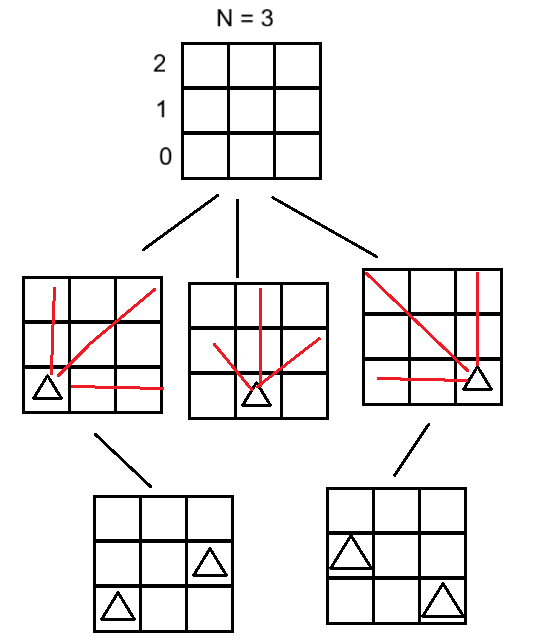 图中决策树的每个节点,代表 “在某一行放置皇后的位置”,如果每个分支因某一列或者对角线冲突直接剪枝;最终能走到叶子节点时,就是一个合法的 “N 皇后布局”。