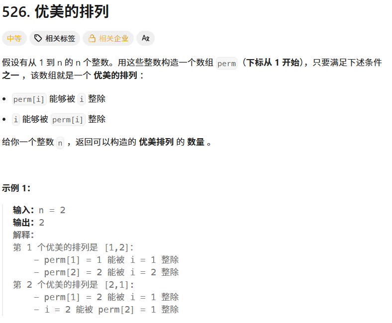 给定整数 n,计算并返回可以构造出的优美排列的总数量。数组 perm 需满足下述 两个条件之一,即可称为 “优美的排列”:
