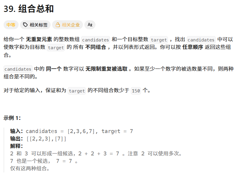 class Solution {int aim = 0;List<Integer> path;List<List<Integer>> ret;public List<List<Integer>> combinationSum(int[] candidates, int target) {aim = target;path = new ArrayList<>();ret = new ArrayList<>();// 深搜,从索引0开始,当前和为0dfs(candidates, 0, 0);return ret;}private void dfs(int[] candidates, int pos, int sum) {// 如果当前和等于目标和,将当前路径添加到结果列表中if (sum == aim) {ret.add(new ArrayList<>(path));return;}// 如果当前和大于目标和或者已经遍历完所有候选数字,则返回if (sum > aim || pos >= candidates.length) {return;}for (int i = pos; i < candidates.length; i++) {path.add(candidates[i]);dfs(candidates, i, sum + candidates[i]);// 回溯,移除最后添加的数字path.remove(path.size() - 1);}}