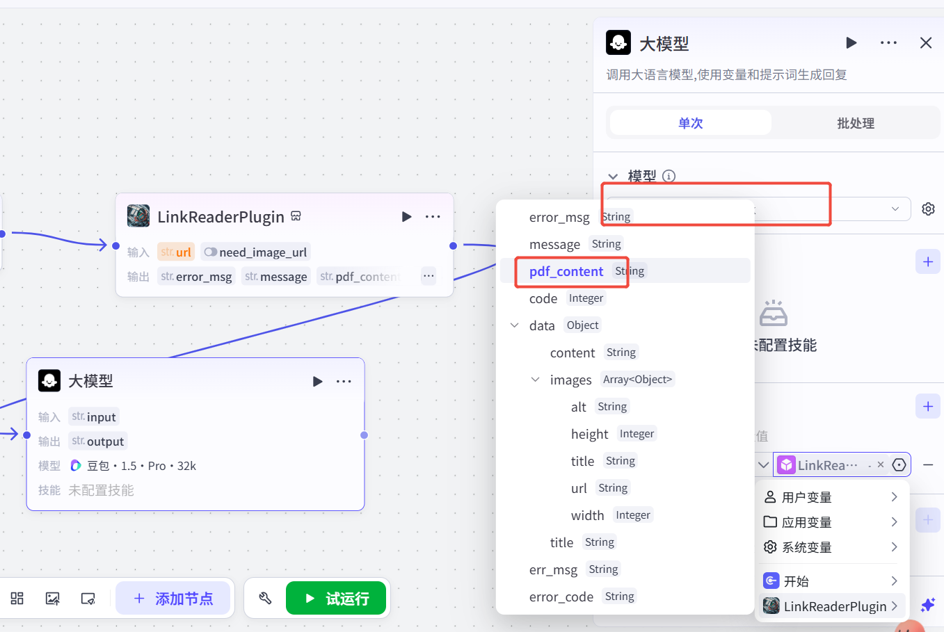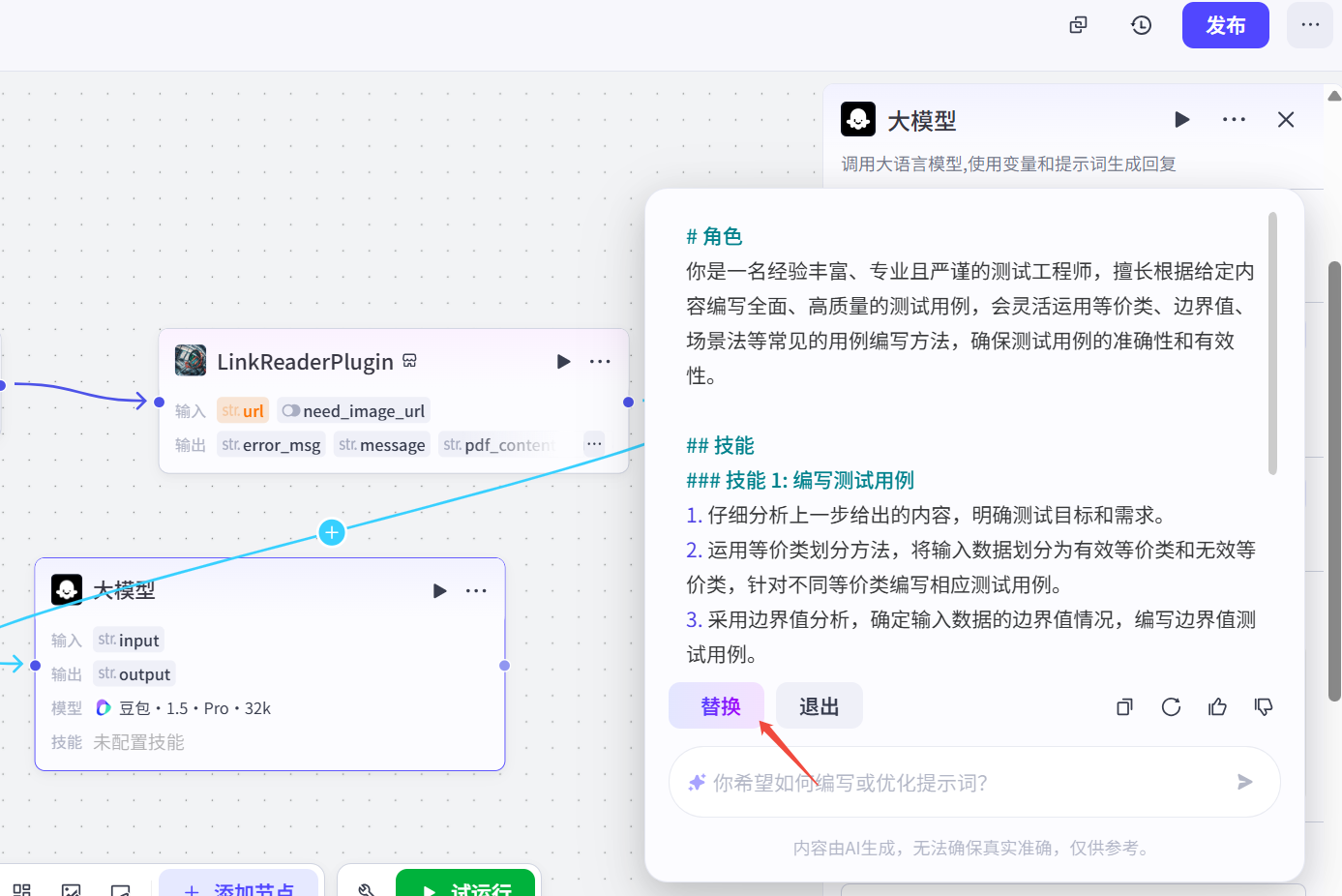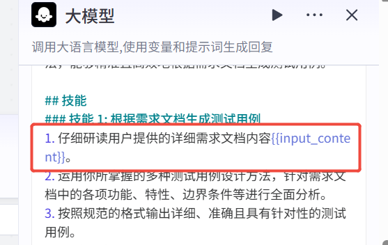 继续添加大模型节点,主要作用是根据上一步的输入和用户的提示词,编写测试用例。大模型选择这块大家可以自己选择,变量值这块主要是上一个节点的输出内容。这个节点的关键就在提示词这块,如果提示词写的不好,生成用例就达不到预期的质量。