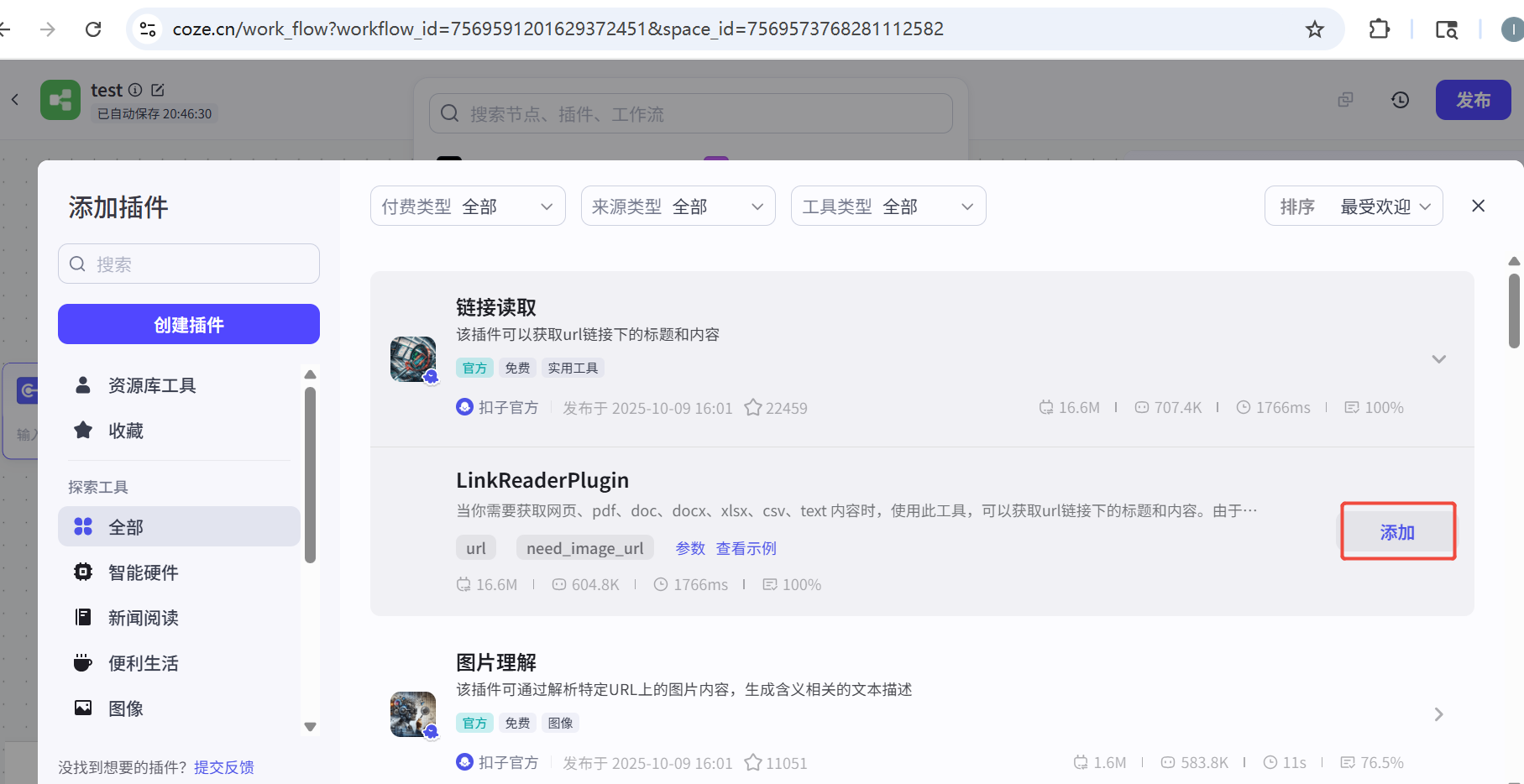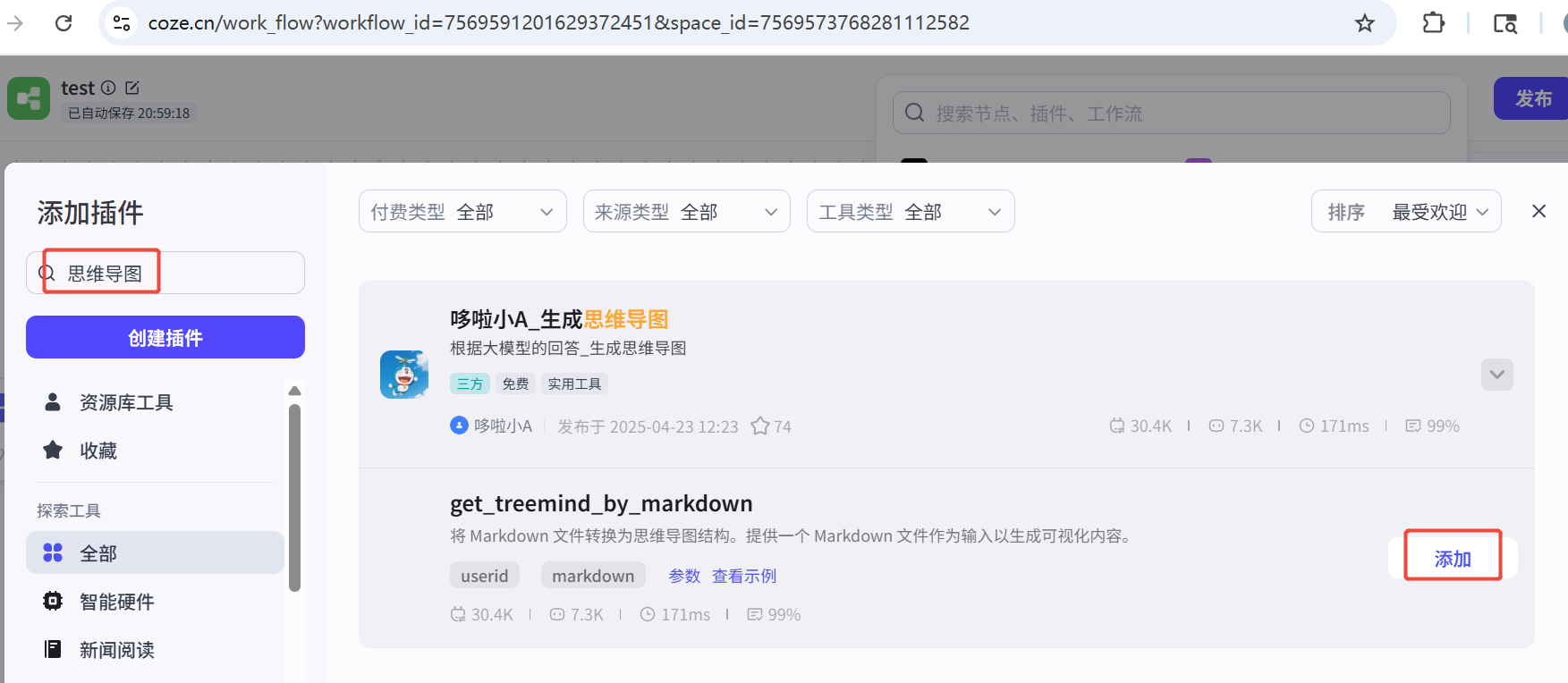 添加节点-插件-搜索思维导图-选择第一个,点击添加