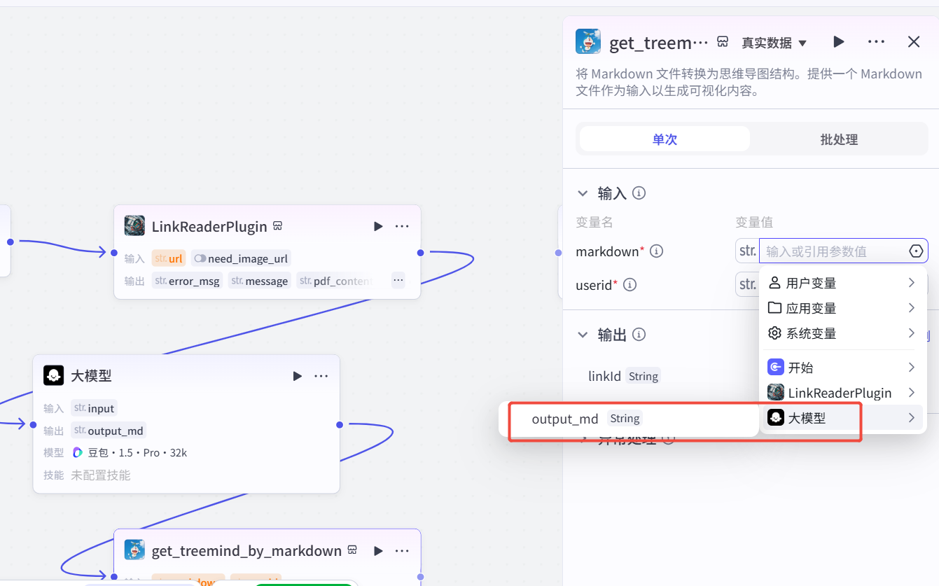 接着我们添加下一个节点,主要作用是把大模型输出的md转化成可读性比较高的思维导图