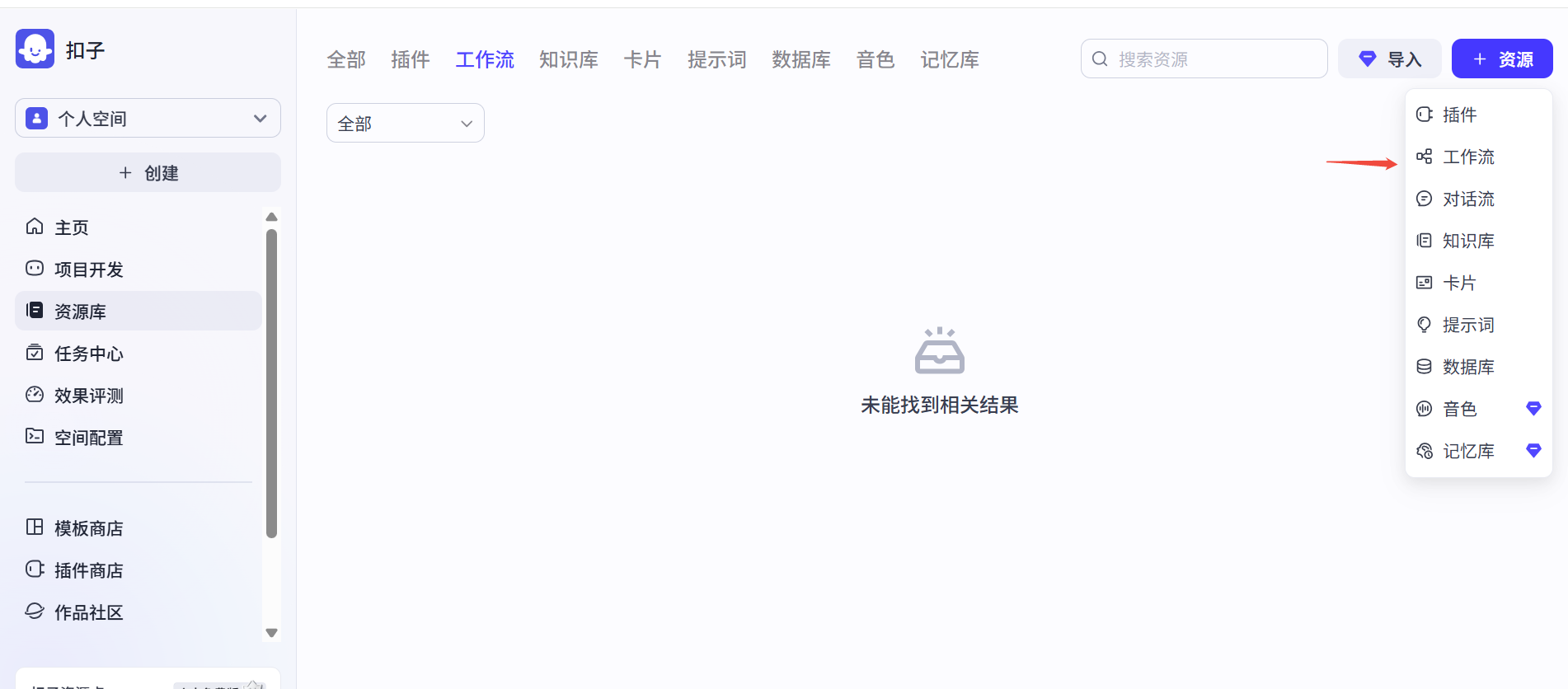 二、选择资源-工作流,在工作流弹框种输入名称和描述信息,描述信息要认真填写哈,后面大模型会用到。工作流创建成功后默认就有开始和结束节点了。