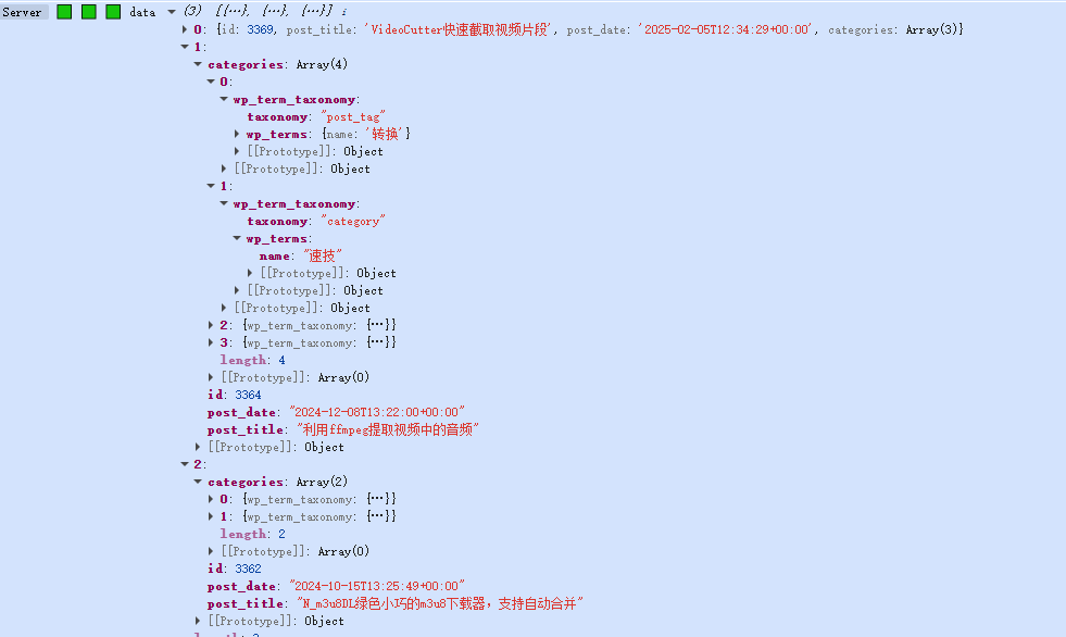 const { data, error } = await supabase.from('wp_posts').select(`id,post_title,categories:wp_term_relationships(wp_term_taxonomy(taxonomy,wp_terms(name)))`).eq('post_status', 'publish')//.eq('wp_term_relationships.wp_term_taxonomy.taxonomy', 'post_tag').limit(3);