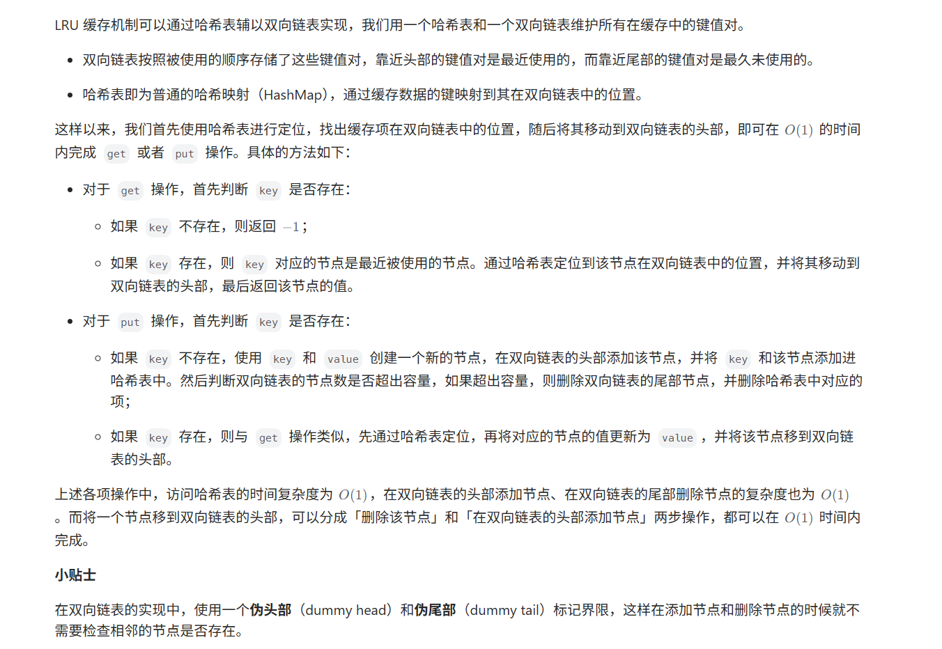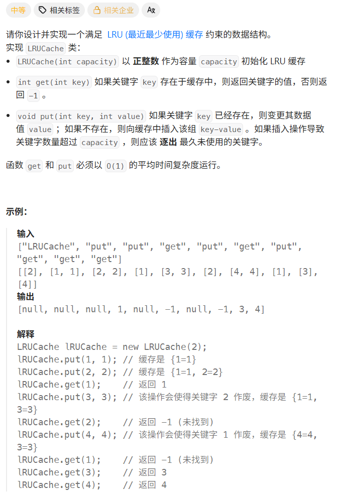 public class LRUCache {class DLinkedNode {int key;int value;DLinkedNode prev;DLinkedNode next;public DLinkedNode() {}public DLinkedNode(int _key, int _value) {key = _key; value = _value;}}private Map<Integer, DLinkedNode> cache = new HashMap<Integer, DLinkedNode>();private int size;private int capacity;private DLinkedNode head, tail;public LRUCache(int capacity) {this.size = 0;this.capacity = capacity;// 使用伪头部和伪尾部节点head = new DLinkedNode();tail = new DLinkedNode();head.next = tail;tail.prev = head;}public int get(int key) {DLinkedNode node = cache.get(key);if (node == null) {return -1;}// 如果 key 存在,先通过哈希表定位,再移到头部moveToHead(node);return node.value;}public void put(int key, int value) {DLinkedNode node = cache.get(key);if (node == null) {// 如果 key 不存在,创建一个新的节点DLinkedNode newNode = new DLinkedNode(key, value);// 添加进哈希表cache.put(key, newNode);// 添加至双向链表的头部addToHead(newNode);++size;if (size > capacity) {// 如果超出容量,删除双向链表的尾部节点DLinkedNode tail = removeTail();// 删除哈希表中对应的项cache.remove(tail.key);--size;}}else {// 如果 key 存在,先通过哈希表定位,再修改 value,并移到头部node.value = value;moveToHead(node);}}private void addToHead(DLinkedNode node) {node.prev = head;node.next = head.next;head.next.prev = node;head.next = node;}private void removeNode(DLinkedNode node) {node.prev.next = node.next;node.next.prev = node.prev;}private void moveToHead(DLinkedNode node) {removeNode(node);addToHead(node);}private DLinkedNode removeTail() {DLinkedNode res = tail.prev;removeNode(res);return res;}