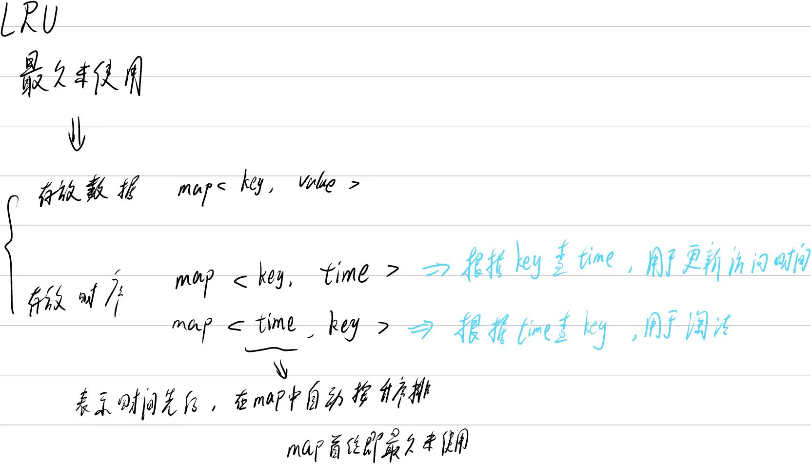 class LRUCache {Map<Integer, Integer> data;Map<Integer, Integer> key_time; //根据key查询时间Map<Integer, Integer> time_key; //根据时间查询keyint now_time = 0; //当前时间int len = 0; //最大数据存放量public LRUCache(int capacity) {data = new HashMap();key_time = new HashMap();time_key = new TreeMap();len = capacity;}public int get(int key) {if(data.containsKey(key)){ //找到数据time_key.remove(key_time.get(key)); //更新访问时间time_key.put(now_time, key);key_time.put(key, now_time++); //返回数据return data.get(key);}return -1;}public void put(int key, int value) {if(data.containsKey(key)){ //判断数据原先是否存在data.put(key, value); //更新数据time_key.remove(key_time.get(key)); //更新原本的时间time_key.put(now_time, key);key_time.put(key, now_time++);}else{ //正常添加if(data.size() == len){ //队满了Map.Entry<Integer, Integer> firstEntry = time_key.entrySet().iterator().next(); //淘汰最早的(时间最前的)int k = firstEntry.getValue();time_key.remove(key_time.get(k));key_time.remove(k);data.remove(k);}data.put(key, value);key_time.put(key, now_time);time_key.put(now_time++, key);}}