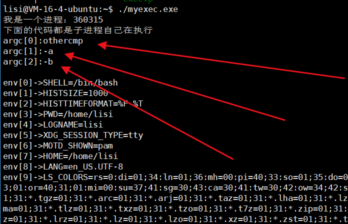 {printf("我是一个进程:%d\n",getpid());pid_t id = fork();if(id == 0)//子进程{sleep(2);printf("下面的代码都是子进程自己在执行\n");char* myargv[] = {(char*)"othercmp",(char*)"-a",(char*)"-b",NULL};char* myenv[] = {(char*)"PATH = /home/lisi",NULL};extern char** environ;//继承父进程的环境变量execvpe("othercmp.exe",myargv,myenv);exit(3);}int status = 0;pid_t rid = waitpid(id,&status,0);if(rid > 0){printf("wait success,exit_code:%d\n",WEXITSTATUS(status));}return 0;