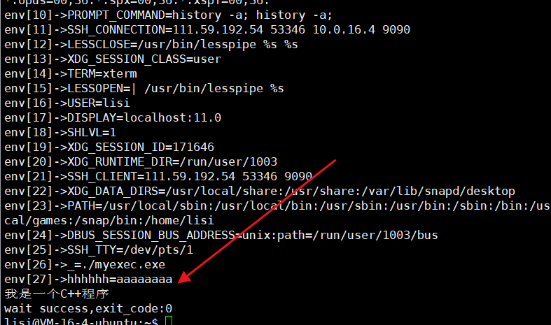 {for(int i = 0; i < argc; i++){printf("argc[%d]:%s\n",i,argv[i]);}std::cout << "\r\n";for(int j = 0;env[j];j++){printf("env[%d]->%s\n",j,env[j]);}//std::cout << "我是一个C++程序" << std::endl;//std::cout << "我是一个C++程序" << std::endl;//std::cout << "我是一个C++程序" << std::endl;std::cout << "我是一个C++程序" << std::endl;return 0;