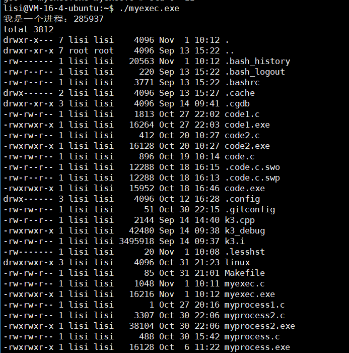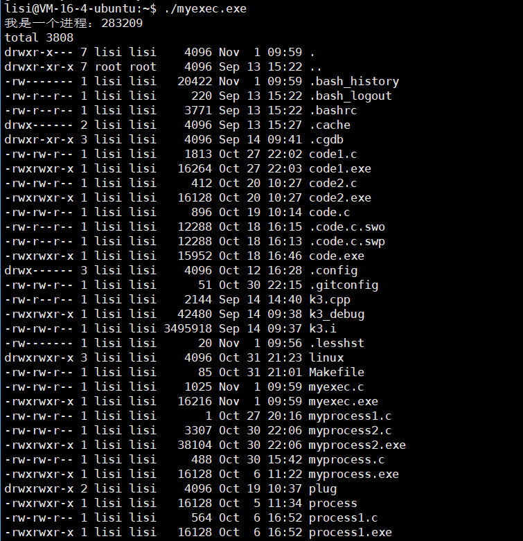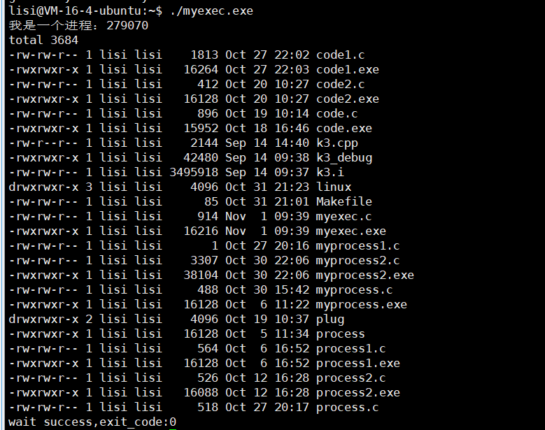 {printf("我是一个进程:%d\n",getpid());pid_t id = fork();if(id == 0)//子进程{//执行另外一个程序的代码//execl("/usr/bin/xxx","ls","-a","-l",NULL);//程序替换函数,此时执行的ls文件的代码execlp("ls","ls","-a","-l",NULL);exit(1);}int status = 0;pid_t rid = waitpid(id,&status,0);if(rid > 0){printf("wait success,exit_code:%d\n",WEXITSTATUS(status));}return 0;