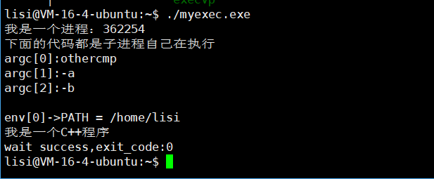 {printf("我是一个进程:%d\n",getpid());pid_t id = fork();if(id == 0)//子进程{sleep(2);printf("下面的代码都是子进程自己在执行\n");char* myargv[] = {(char*)"othercmp",(char*)"-a",(char*)"-b",NULL};char* myenv[] = {(char*)"PATH = /home/lisi",NULL};extern char** environ;//继承父进程的环境变量putenv((char*)"hhhhhh=aaaaaaaa");execvpe("othercmp.exe",myargv,environ);exit(3);}int status = 0;pid_t rid = waitpid(id,&status,0);if(rid > 0){printf("wait success,exit_code:%d\n",WEXITSTATUS(status));}return 0;