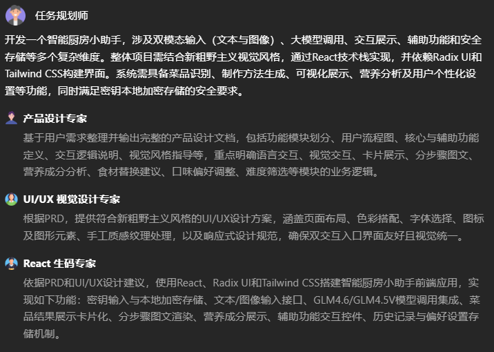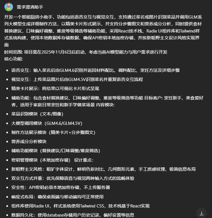 与需求收集助手交互完毕之后,需求澄清助手会结合我们的开发提示词以及各个确认的需求,形成一个更加完善的提示词,包含我们没有提到的技术栈、组件库、样式库等等,以及将核心功能拆分为几大点,任务更加细致。