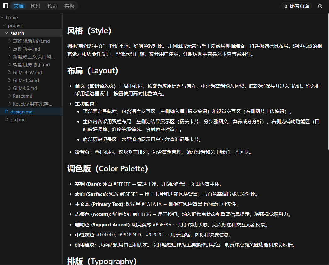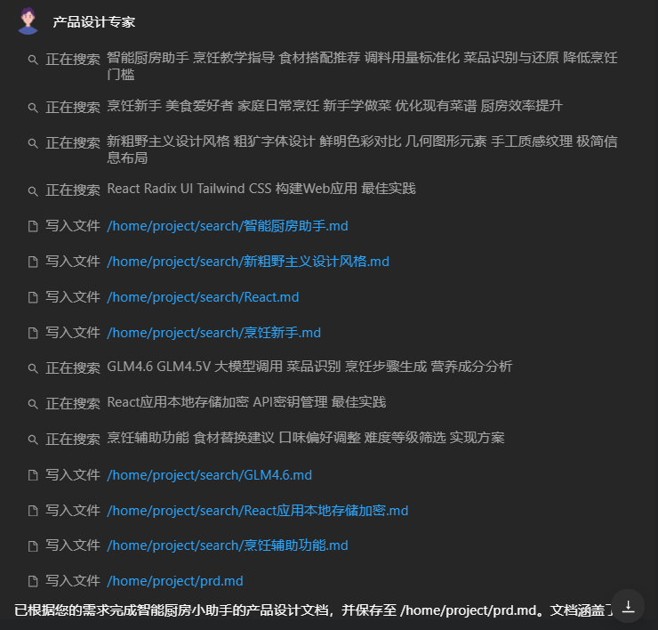 产品设计专家会搜索应用相关的资料并形成具体的开发文档,包含了整体开发文档、风格设计文档、代码官方文档等等。