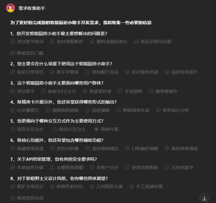 除了理解我们的开发提示词之外,自己还会收集必要的信息,包括但不仅限于:应用向解决的问题、应用场景、用户群体、输出方式、交互方式、辅助功能、安全需求、风格期望等等,可以说是包含了应用开发的方方面面。