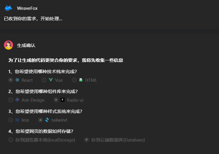 WeaveFox接收到我们的开发提示词之后会初步确认我们的需求,收集一些必要的信息。