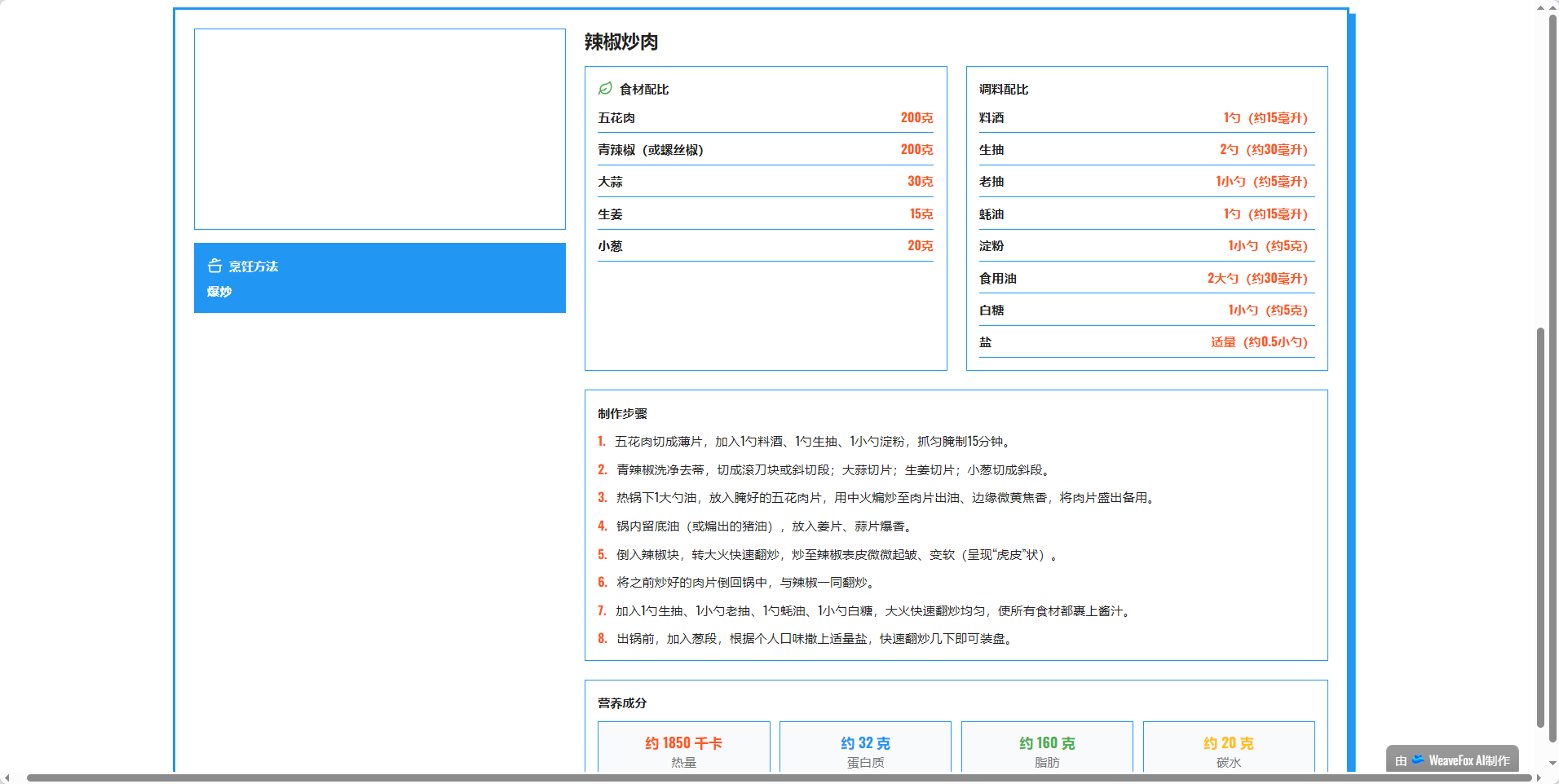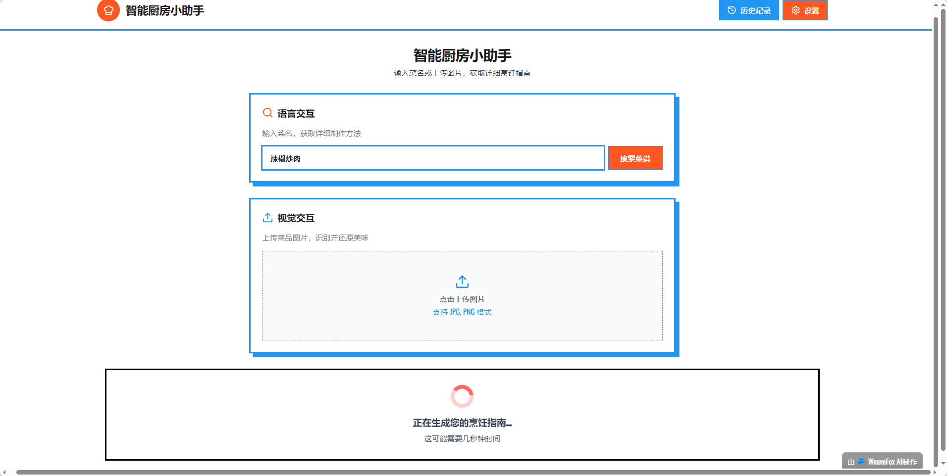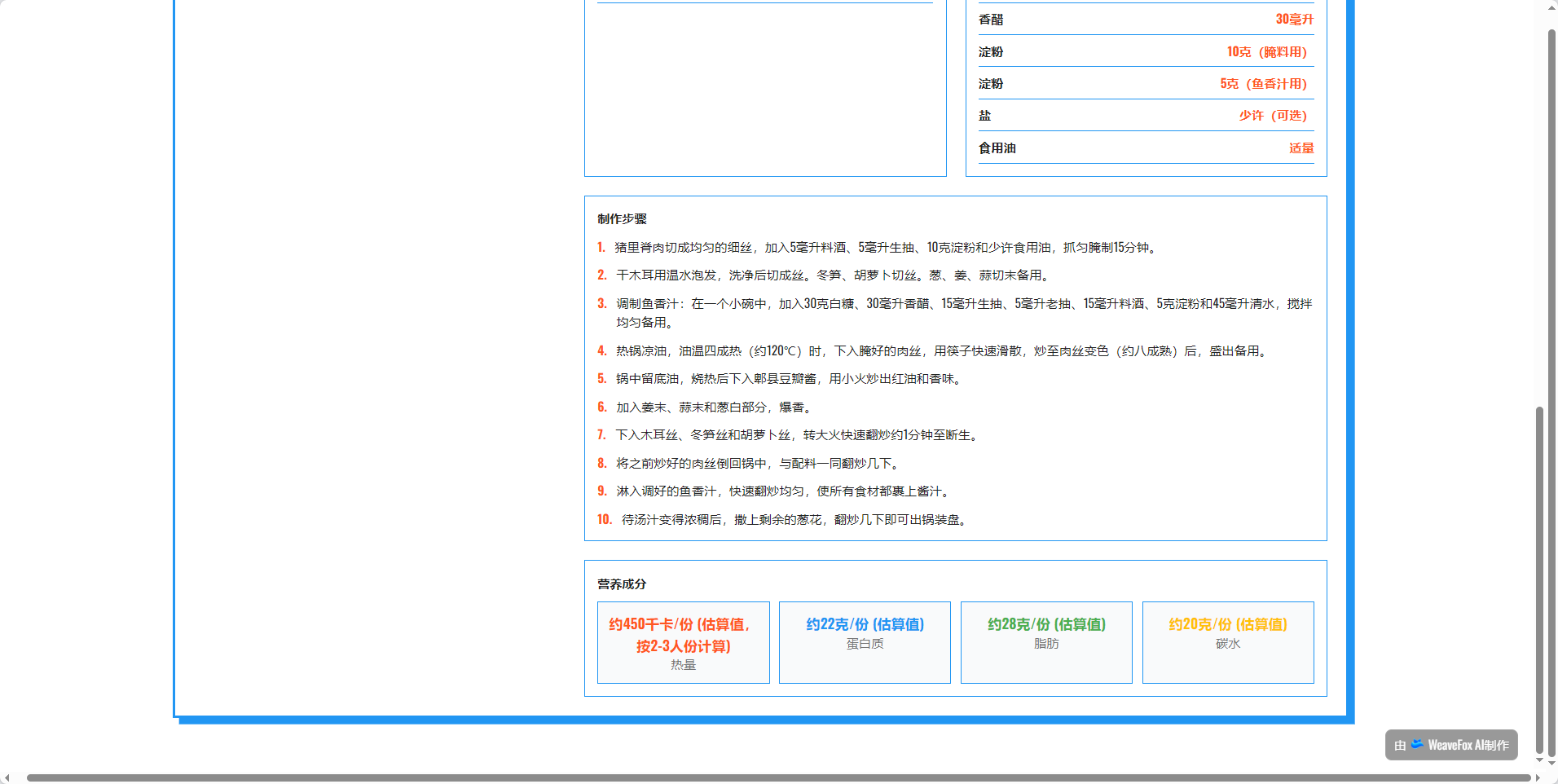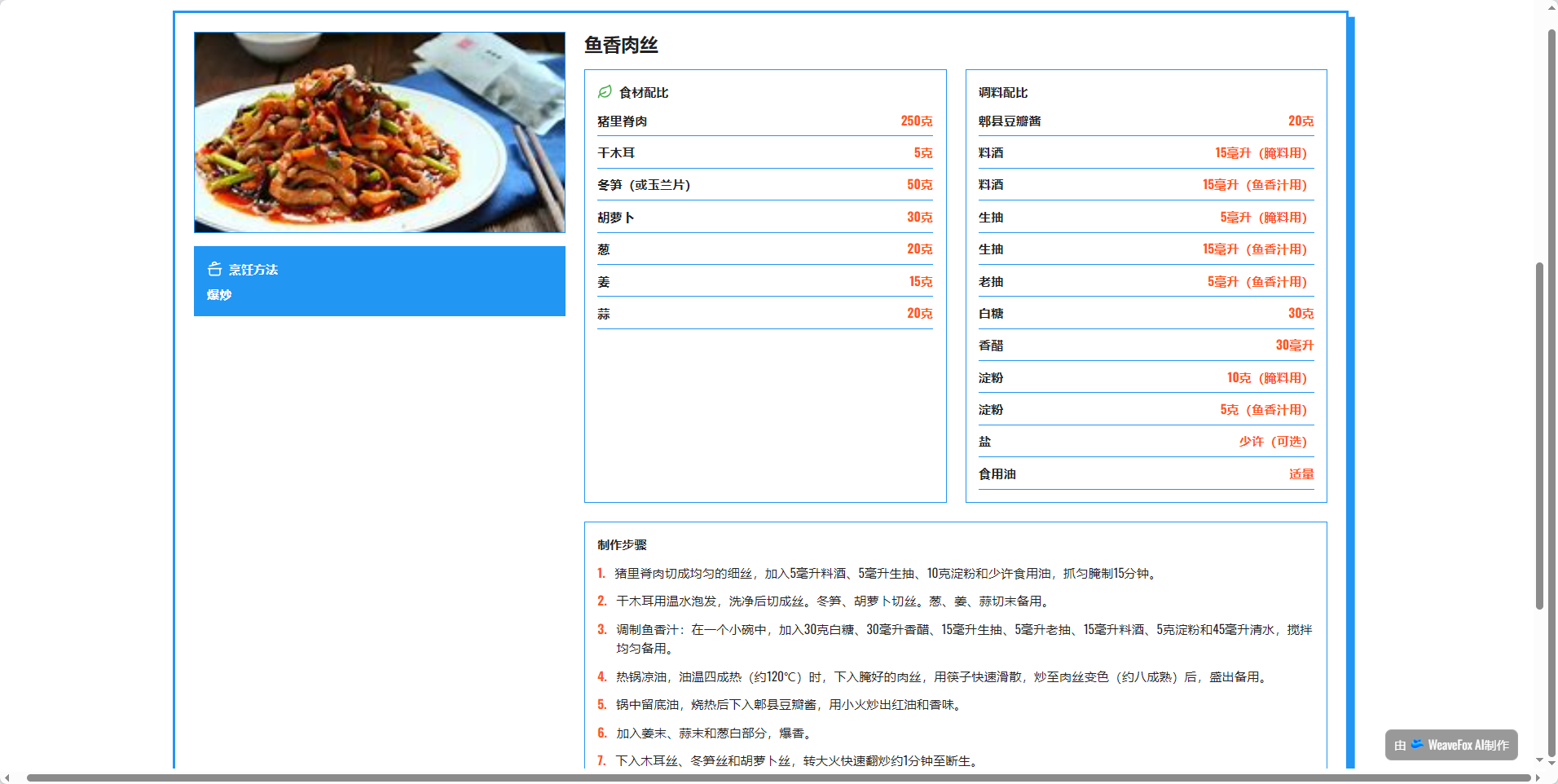 项目已成功上线并公开访问,实测表明其不仅能准确解析“辣椒炒肉”等常见菜名,还能从“鱼香肉丝”图片中识别菜品并生成完整制作流程。这不仅验证了 WeaveFox × GLM 技术栈在垂直场景中的强大落地能力,更展示了 AI 如何以端到端方式重塑日常生活工具的开发范式与交互体验。