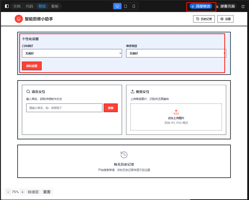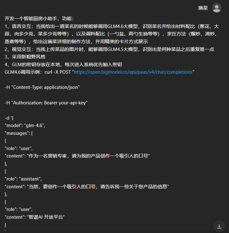 作为一名开发者,我借助 WeaveFox 强大的前端智能生成能力,结合智谱 GLM-4.6 与 GLM-4.5V 大模型在语言理解与多模态识别上的优势,快速构建了一款集语言交互与视觉识别于一体的智能厨房小助手——只需输入菜名或上传菜品图片,它就能自动生成结构化菜谱并以新粗野风格精美呈现,全程本地管理 API 密钥、无需登录,真正实现了低门槛、高自由度的 AI 厨房体验。